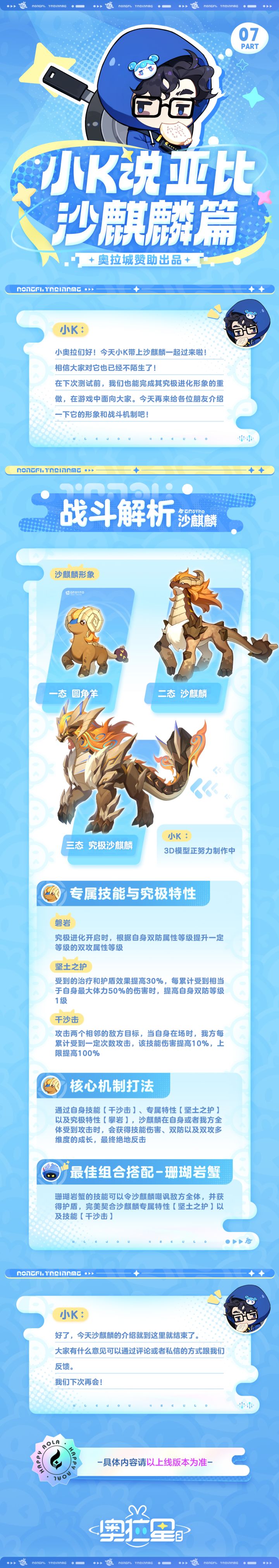 小奥拉们久等了!我是小K今天由我给大家介绍亚比-沙麒麟的形象和战斗机制下次测试前我们将完成其究极形象的重做,在游戏中面向大家也欢迎通过评论或私信给予我们宝贵的意见反馈,下次再会!#奥拉星2#游戏推荐