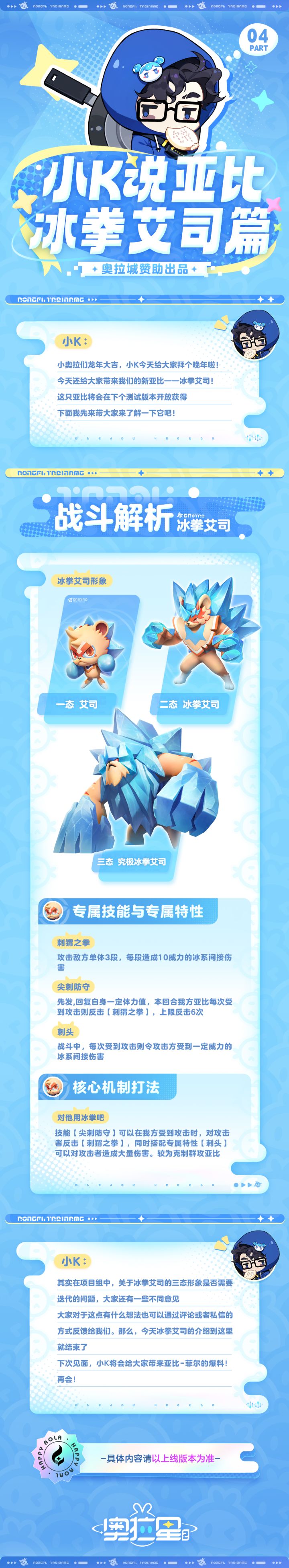 小奥拉们新年好!我是小k今天给大家带来的是亚比-冰拳艾司的战斗解析此外,对于其三态的形象设计,还想听取小奥拉们更多的建议下期将给大家带来亚比-菲尔的爆料,我们下期见!#奥拉星2#游戏推荐