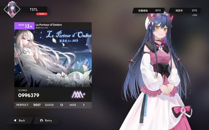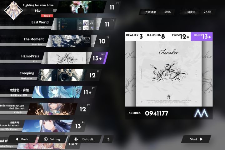 紫ruin的特点是多指谱面,大多数是理论4k,有部分曲含5/6k配置,有一两个整个就是按5/6k标准写的谱(4k以上打不动一点......),主线还没解完,不过已经摸到的两个13+都雀食是难度不低