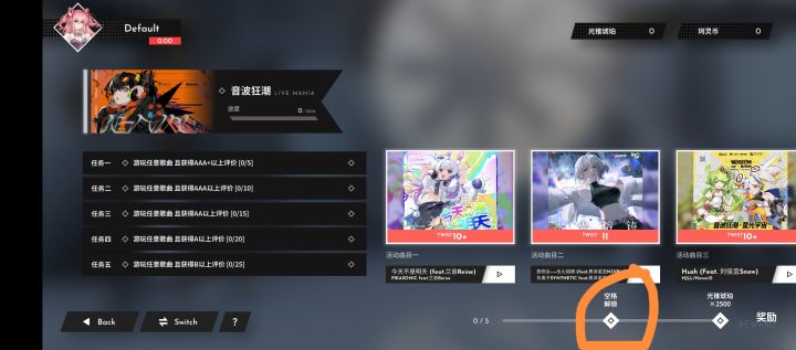 ●游玩歌曲“tsurara”解锁角色莫妮塔(Moneta)——不务正业的娱乐记者●切换角色莫妮塔(Moneta)注:如果没切角色,如下●再次游玩歌曲“tsurara”获取坐标一(记得截图!)●输入坐标一解锁歌曲“Horloge”●游玩歌曲“Horloge”获得线索“虚影”●在角色页面找到桉(Eucaly)(不切角色)获取坐标二(记得截图!)●输入坐标二解锁歌曲“Devil