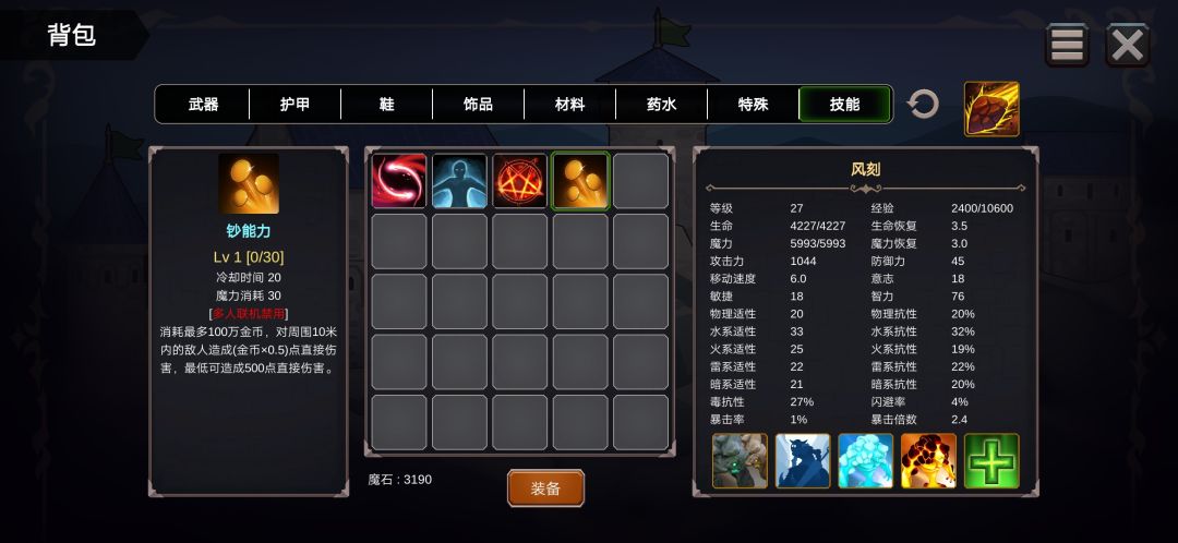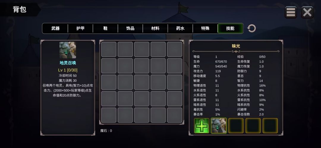 第一个角色选的是召唤师,跟其他人写的一样,智力吊坠加补天石吊坠,这里就不多说。建议第一次玩的人选召唤师,最简单,可以先了解一下游戏。游戏内不到一个月就通关。 第二个角色选的是法师,初始技能选的恢复,初始广告随机五星装备出的是黑暗法师袍,加魔力和防御。法师的攻击是自身魔力的加成,所以装备撑魔不加攻。感觉法师的不少技能都是垃圾技能,有用的只有随机爆炸,魔力爆炸,魔法刷新和神圣之光,魔力精通勉强可以用吧