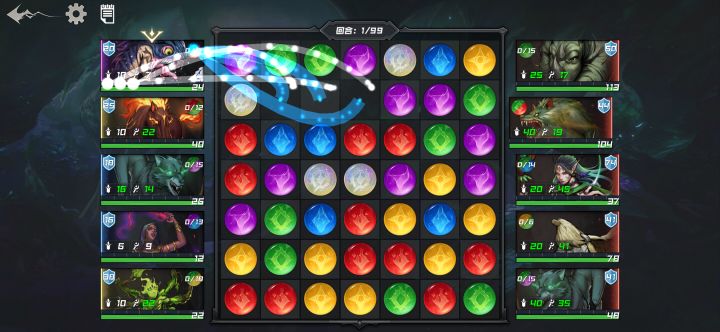 *目前游戏仍处于开发初期阶段,不代表最终品质。仅是对已制作的功能进行阐述。对于没接触过这类玩法的小伙伴而言,即使走完教程也可能没太明白到底怎么玩的。作为制作者,还是十分有必要仔细讲解一下游戏的基础规则。1、战斗设定如图所示,这是一场战斗。左侧是我方随从,右侧是敌方随从,中间棋盘遍布7x7=49个心能。心能总共有红黄蓝绿紫白,6种颜色。作为一个消除游戏,很明显我们要通过交换心能来进行匹配消除
