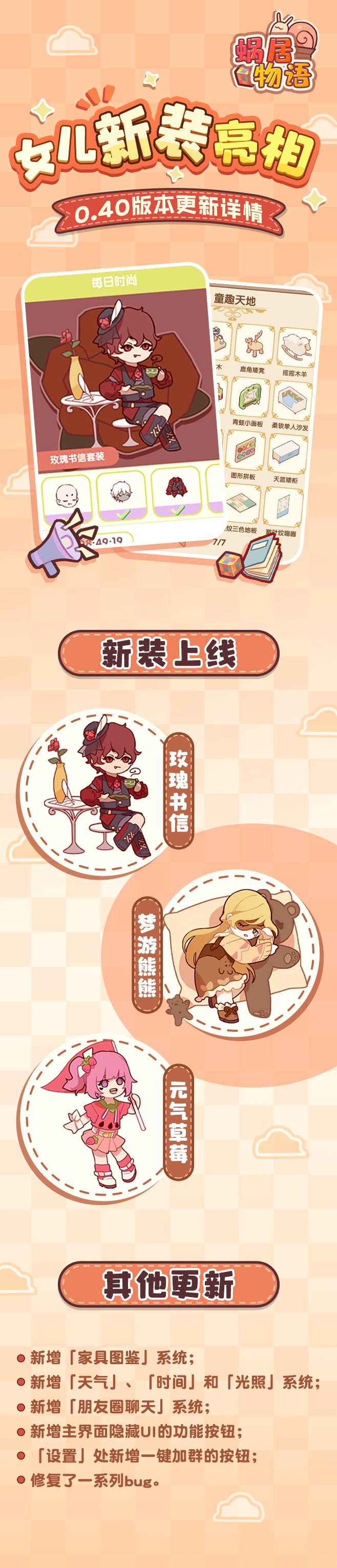 亲爱的小蜗们,小蜗居终于要更新啦~不出意外的话应该明天就可以玩了! 这次会有新的三套衣服套装,还加了「家具图鉴」、「天气」等系统和功能~ 想要了解详细内容,可以点击图片看看呀!(美术小姐姐肝了一天做出来的!想被夸夸) 其实目前开发进度其实还不到50%,后面还会有很多玩法,宠物系统、宠物家具等等都会安排上,敬请期待呀~ 我们二人组开发能力有限,测试目前是在iOS端进行,内容完善后也会上Android