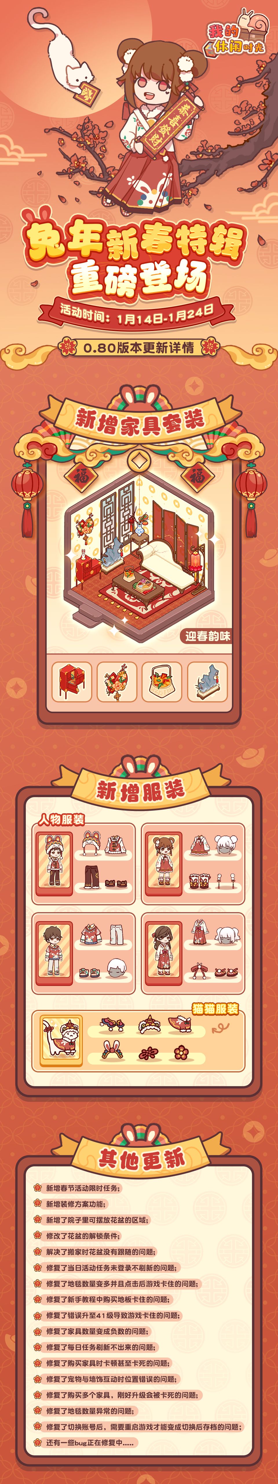 亲爱的小蜗们,新年来临 我们先给大家拜个早年,祝大家新年快乐~ 当然,我们也带着新版本来和大家共度新年啦,新版本会在12日早上10点上线喔! 本次新年版本的活动时间为:1月14日00:00-1月24日23:59 注意!新年限时任务在1月23日23:59结束,商店兑换活动在1月24日23:59结束,小蜗们不要错过兑换时间哟~ 新年限时任务即将开启,小蜗可以通过完成任务获得限时货币,兑换新年主题单品~