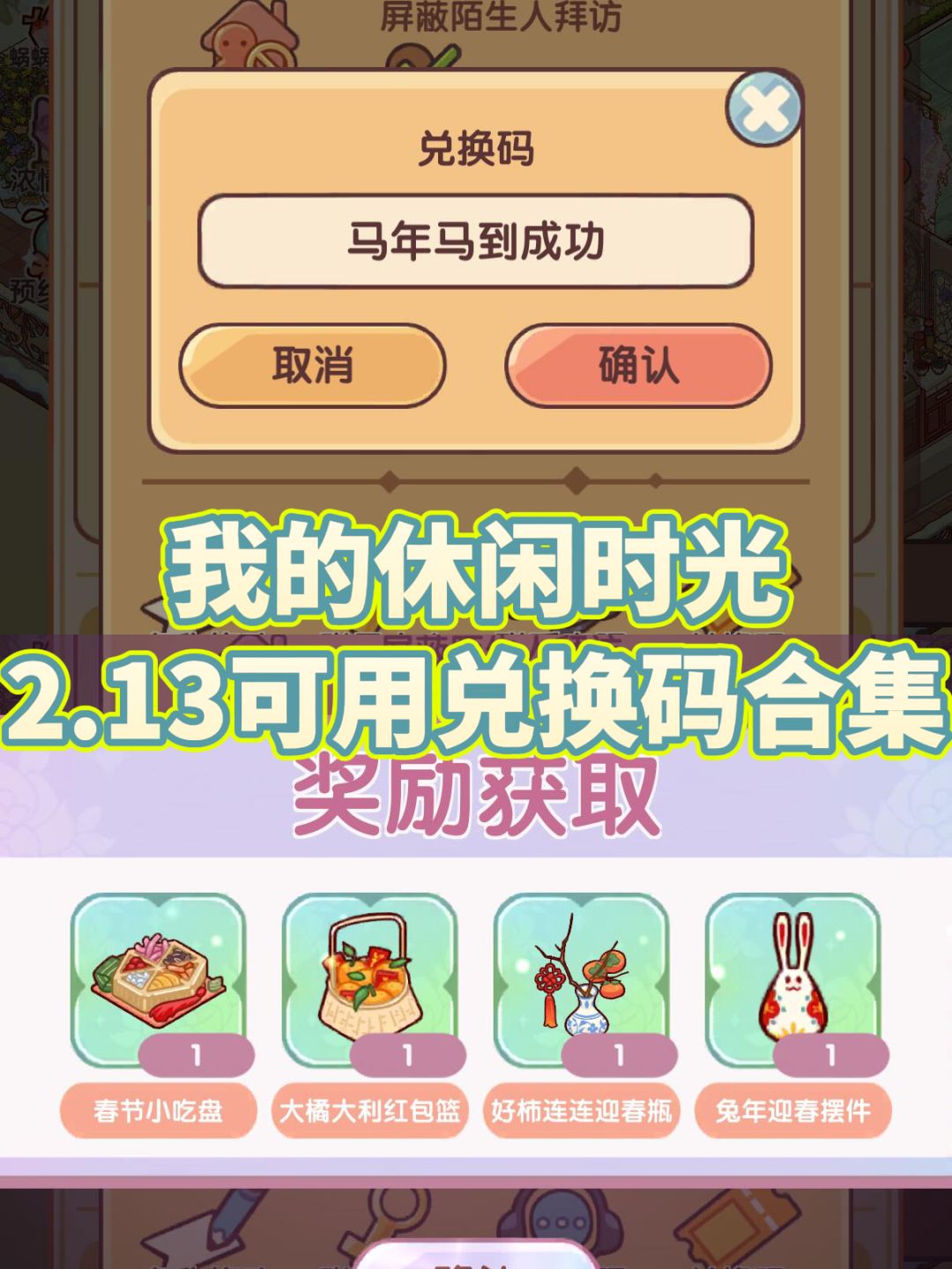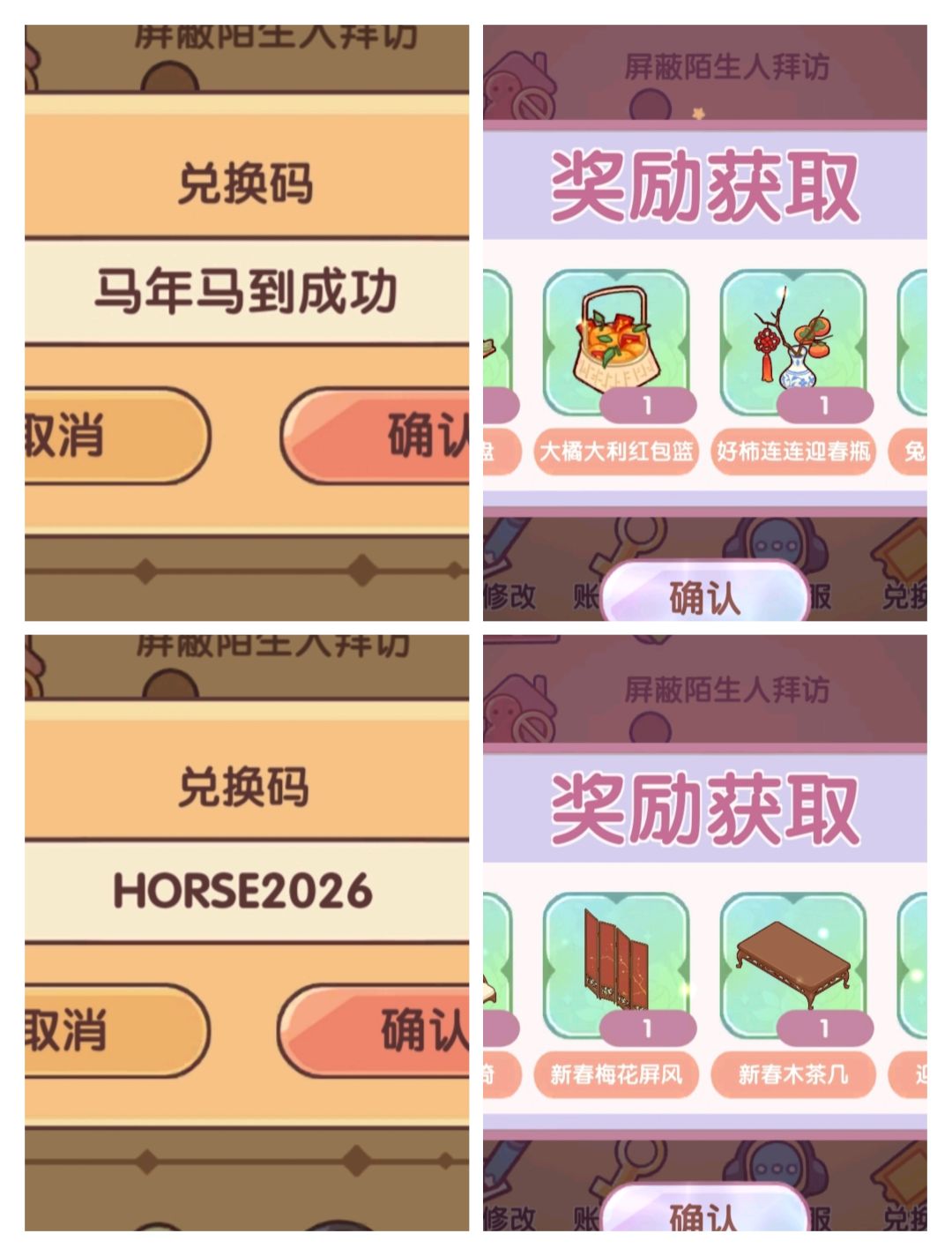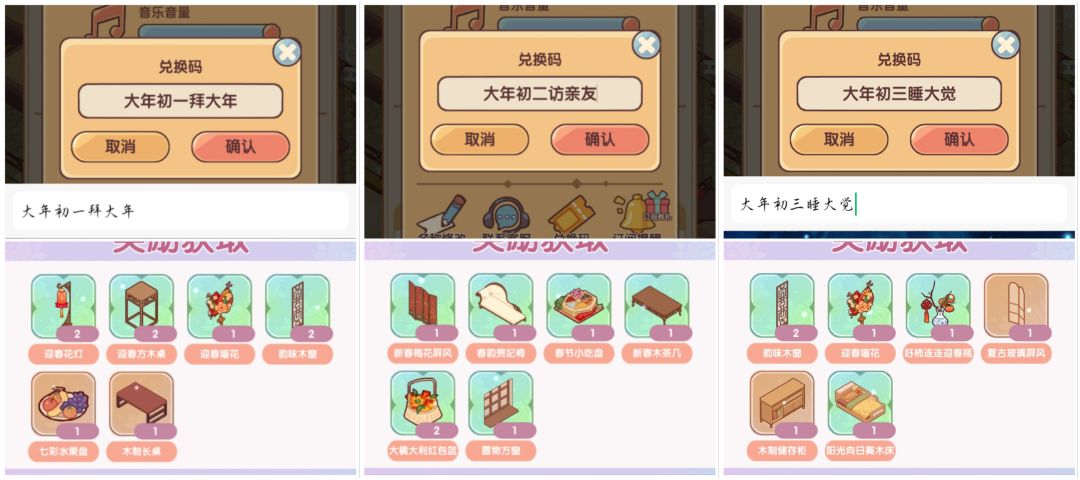 兑换码:大年初一拜大年 兑换奖励:迎春花灯x2、迎春方木桌x2、迎春墙花 x1、韵味木窗x2、七彩水果盘x1、木制长桌x1 有效时间:至2月4日 兑换码:大年初二访亲友 兑换奖励:新春梅花屏风x1、春韵贵妃椅x1、春节 小吃盘x1、新春木茶几x1、大橘大利红包篮x2、置物方窗x1 有效时间:至2月4日 兑换码:大年初三睡大觉 兑换奖励:韵味木窗×2、迎春墙花×1、好柿连连迎春瓶×1、复古玻璃屏风