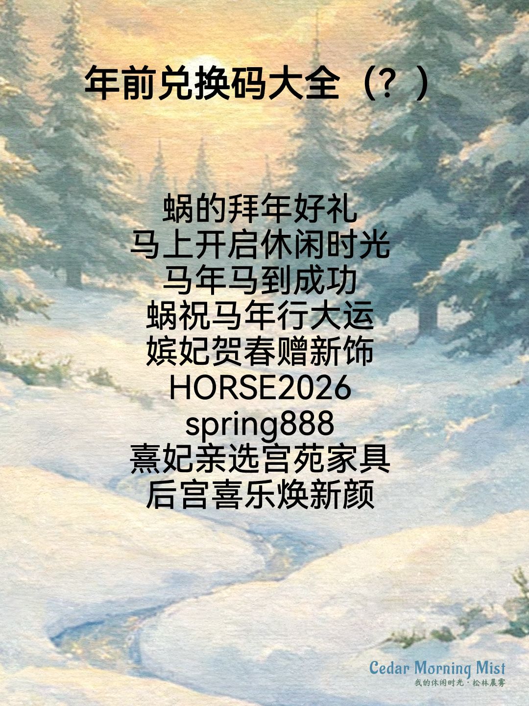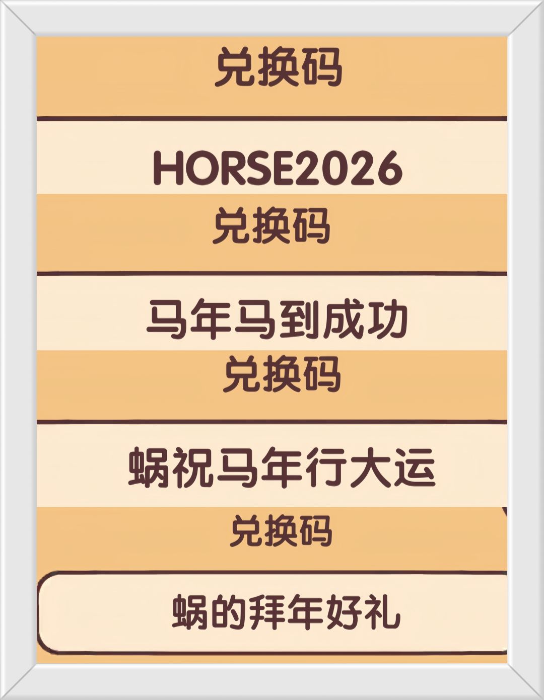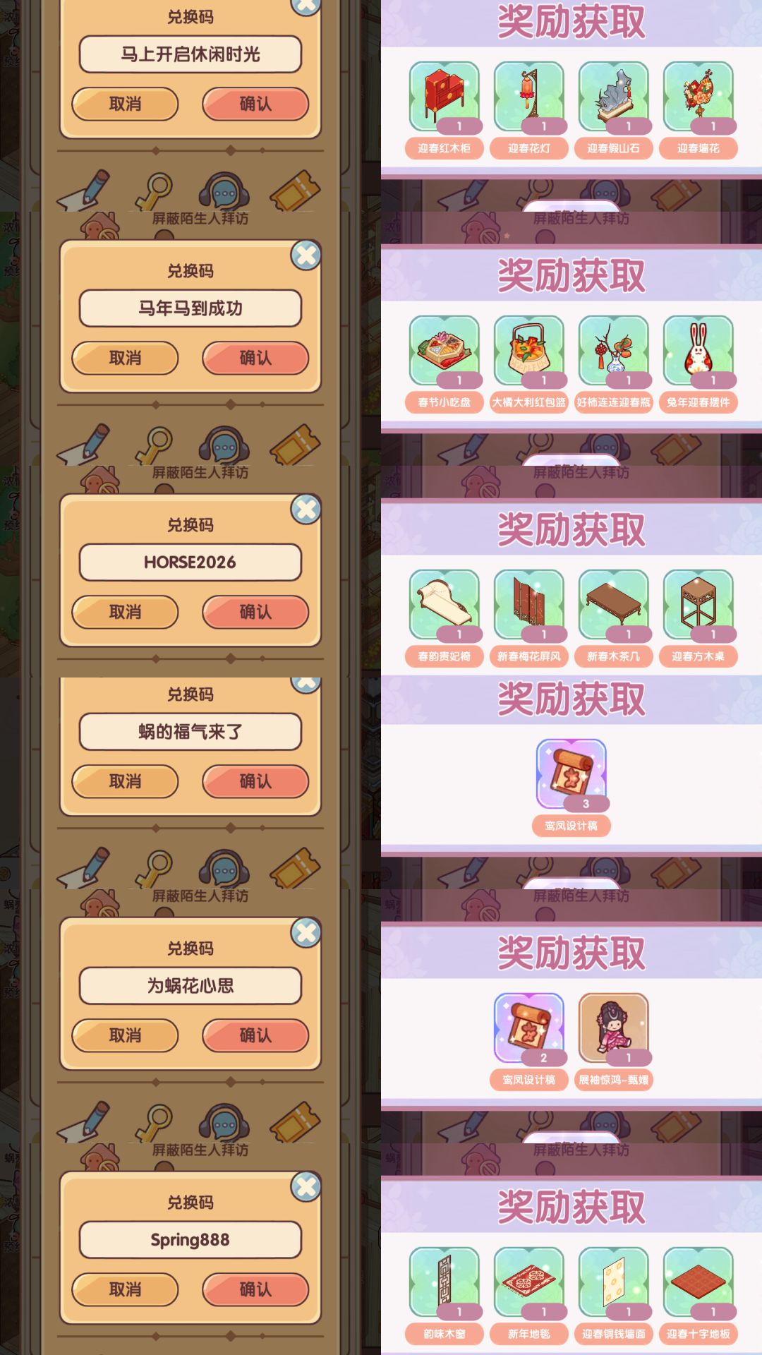 兑换码:大年初一拜大年 兑换奖励:迎春花灯x2、迎春方木桌x2、迎春墙花 x1、韵味木窗x2、七彩水果盘x1、木制长桌x1 有效时间:至2月4日 兑换码:大年初二访亲友 兑换奖励:新春梅花屏风x1、春韵贵妃椅x1、春节 小吃盘x1、新春木茶几x1、大橘大利红包篮x2、置物方窗x1 有效时间:至2月4日 兑换码:大年初三睡大觉 兑换奖励:韵味木窗×2、迎春墙花×1、好柿连连迎春瓶×1、复古玻璃屏风