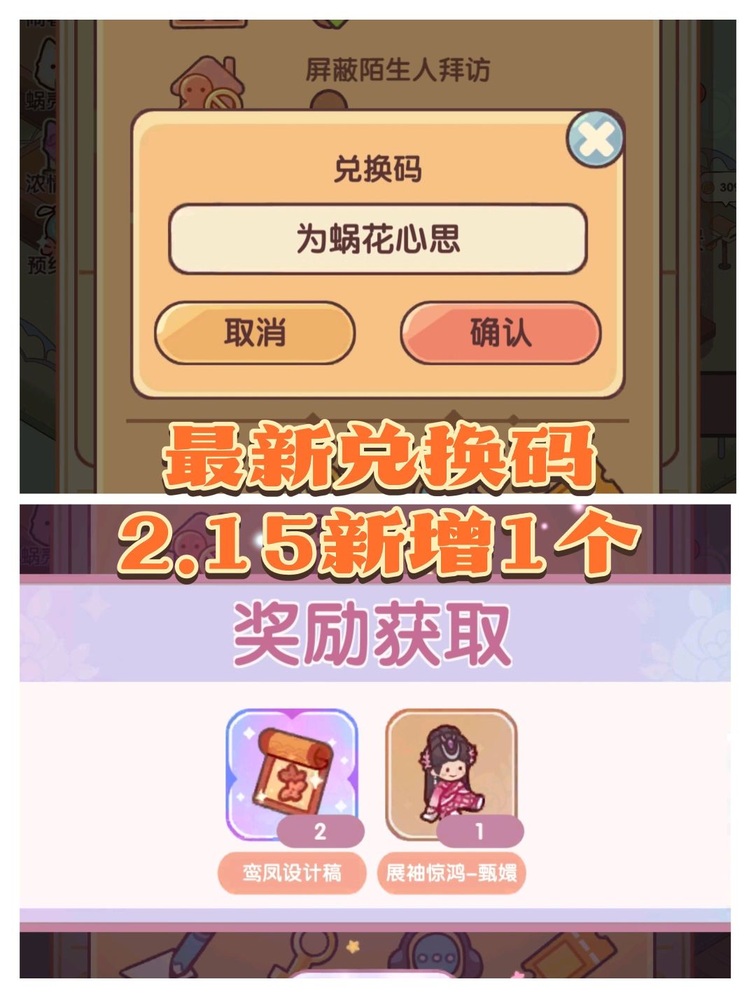 兑换码:休闲时光共团圆 兑换奖励:金币×888、不锈钢揉面盆×1、木制擀面杖×1、一碗腊八粥×1、面包抽纸盒×1 有效时间: 兑换码:悠悠新春福临门 兑换奖励:金币×888、新春木茶几×1、原味袋装薯片×11、原味罐装薯片×11、番茄袋装薯片×11、番茄罐装薯片×11 有效时间: 兑换码:味满佳肴聚唐楼 兑换奖励:华灯设计稿×3、蜗壳币×60 有效日期:至2月4日 兑换码:我在蜗居过新年 兑