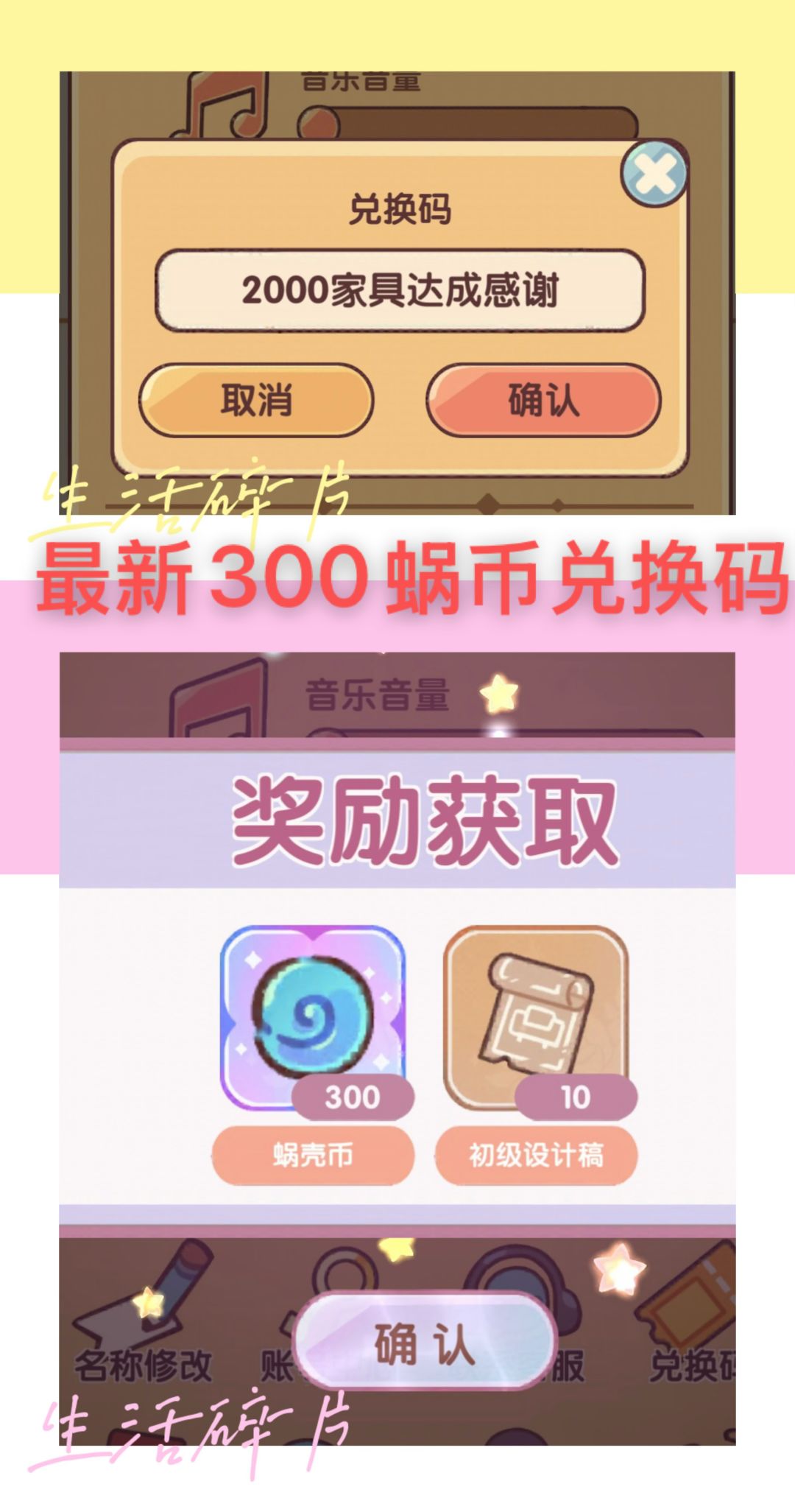 兑换码:2000家具达成感谢 奖励:300蜗壳币+10*初级设计稿 兑换日期:10月30~11月5 集美们快冲啊# #今天游戏圈发生了啥 #发现好游戏 #我的休我的休闲时光 #我的休闲时光 #我的休我的休闲时光 #我的休闲时光兑换码 #我的休闲时光公测 #我的休闲时光创作 #我的休闲时光创作官 #我的休闲时光礼包码 #我的休闲时光蜗居物语