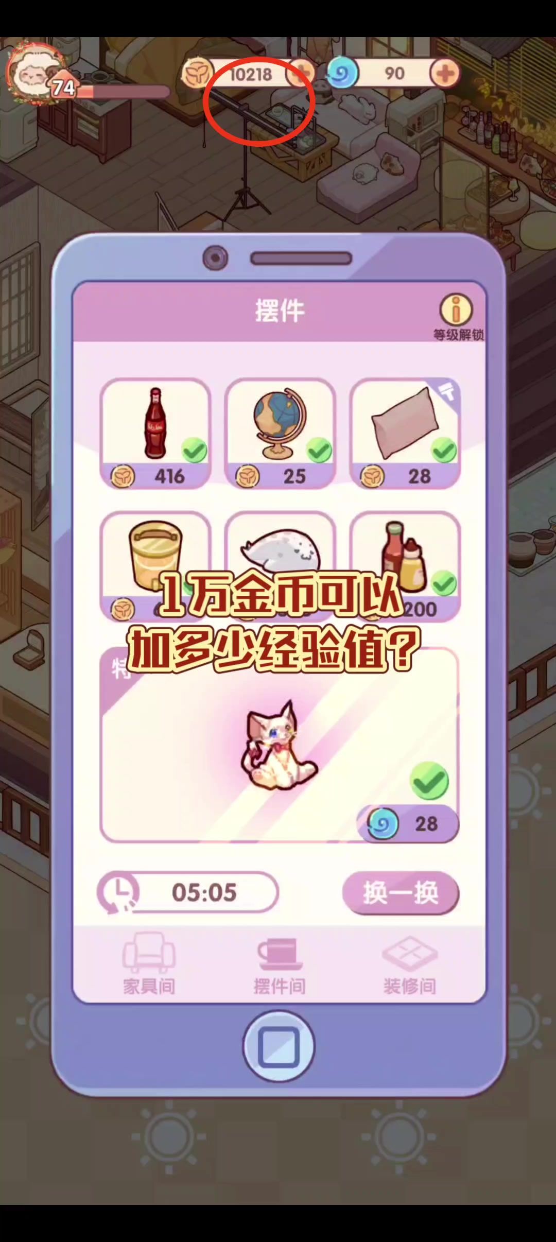 时光礼包很好看但是需要攒够一定金币份额才能购买但是新手金币往往不足这个时候我们就可以刷金币在逸家家居中往往会刷到一些25金币一个的小摆件(如地球仪小抱枕等)购买一次后可以获得十点经验值和二十五点礼包的金币经验值一次最多购买99个多次购买99个在二手平台卖出可以短时间内利用少量金币刷大量的经验二手市场卖出物品是以四折卖出25金币的小摆件卖完后只能获得十金币所以15金币=10点房屋经验值(可以升级解锁