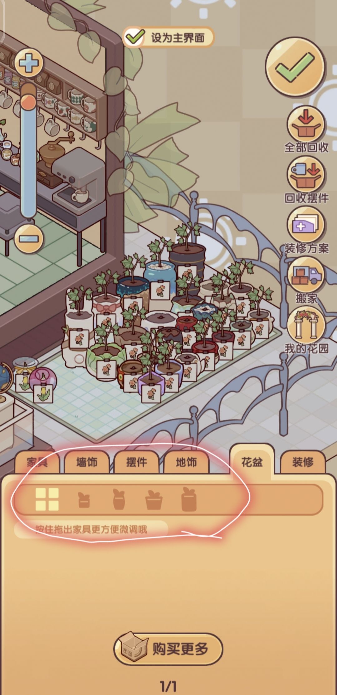 如题,不包括水培共24个花盆,5个高大盆,5个矮大盆,5个细长盆,9个小的 原因:①这样强迫症患者看着舒服,一排高大的,一排胖的,一排细长条的旁边摆一点小的,再来一排小花盆 ②可以在装修-花盆界面区分大中小花盆,然后各类型的花盆间顺序可以变动,比如兔耳朵大花盆可以和蝴蝶结花盆对调 ③种花的时候会发现有些够不着可以选择 a、打开装修界面-再点没种上花的花盆,就很容易选中了 b、房子空间富裕且配件多的