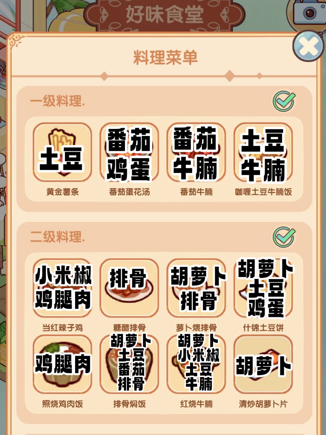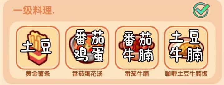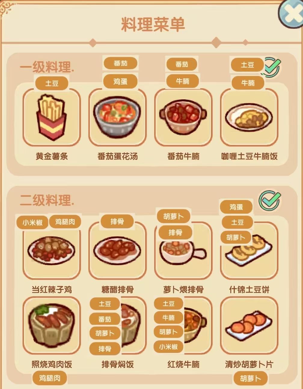 一级料理—————————— 黄金薯条:土豆 番茄蛋花汤:番茄,鸡蛋 番茄牛腩:番茄,牛腩 咖喱土豆牛腩饭:土豆,牛腩 二级料理———————— 当红辣子鸡:小米椒,鸡腿肉 糖醋排骨:排骨 萝卜煨排骨:胡萝卜,排骨 什锦土豆饼:土豆,鸡蛋,胡萝卜 照烧鸡肉饭:鸡腿肉 排骨焖饭:土豆,番茄,胡萝卜,排骨 红烧牛腩:土豆,牛腩,胡萝卜,小米椒 清炒胡萝卜片:胡萝卜 三级料理—————————— 炸茄盒