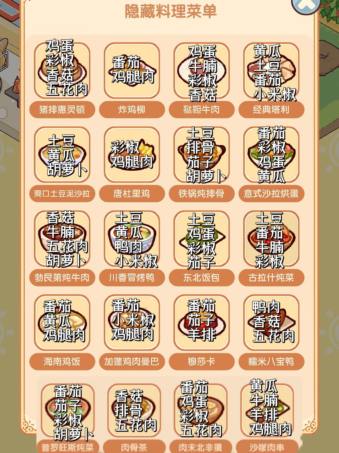 🎉拿到菜谱的UU们,开动啦(˵¯͒〰¯͒˵) [隐藏菜谱]: 🥓猪排惠林顿:鸡蛋、彩椒、五花肉、香菇 🍗炸鸡柳:番茄、鸡腿肉 🥩鞑靼牛肉:鸡蛋、牛腩、彩椒、香菇 🌮经典塔利: 土豆、番茄、小米椒、黄瓜 🥗爽口土豆泥沙拉:土豆、胡萝卜、黄瓜 🍗唐杜里鸡: 鸡腿肉、彩椒 🥘铁锅炖排骨:土豆、胡萝卜、排骨、茄子 🥚意式沙拉烘蛋:番茄、鸡蛋、彩椒、黄瓜 🥩勃艮第炖牛肉:牛腩、胡萝卜、五花肉、香菇 🦆川香冒