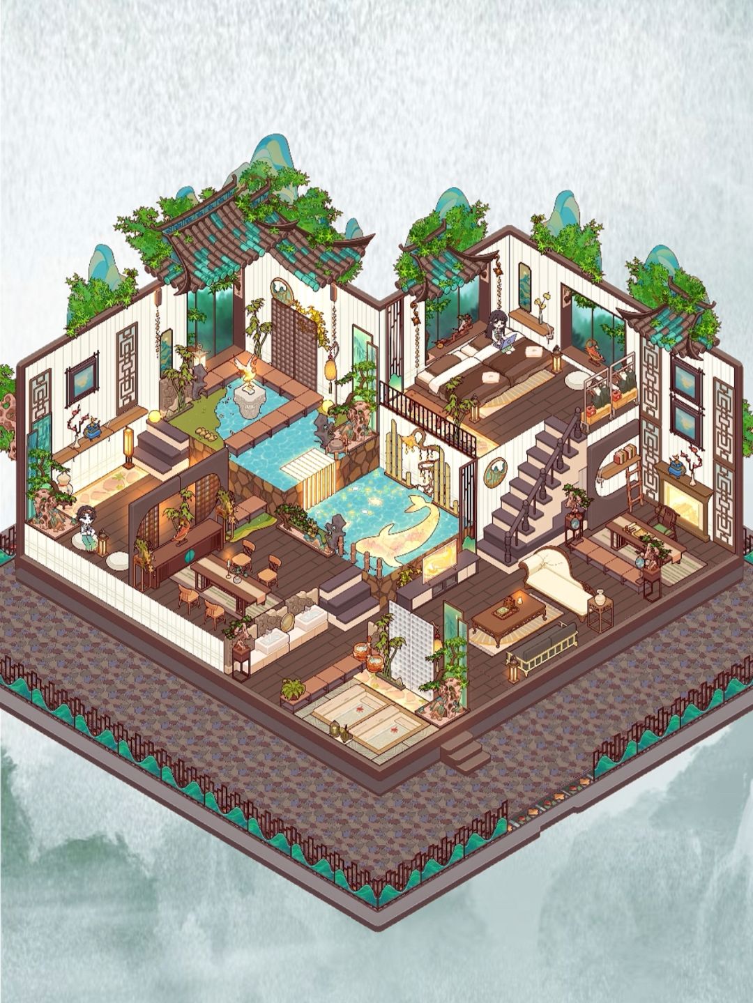 新户型的小错层做了庭院跌水和鱼池 P2:入户庭院--跌水造景(用灯饰做成小瀑布的水景)-鱼池景观 P3:入户前厅-餐厅 P4:照壁-温泉汤池 P5:茶室 P6:挑高书房 P7:吊床-阳台处可观楼下鱼池 新户型其他布局请移步主页~ #少女心游戏安利 #我的休闲时光 #我的休闲时光创作官 #我的休闲时光双人空间 #我的休闲时光攻略 #我的休闲时光蜗居物语 #我的休闲时光装修 #模拟经营 #游戏 #游戏
