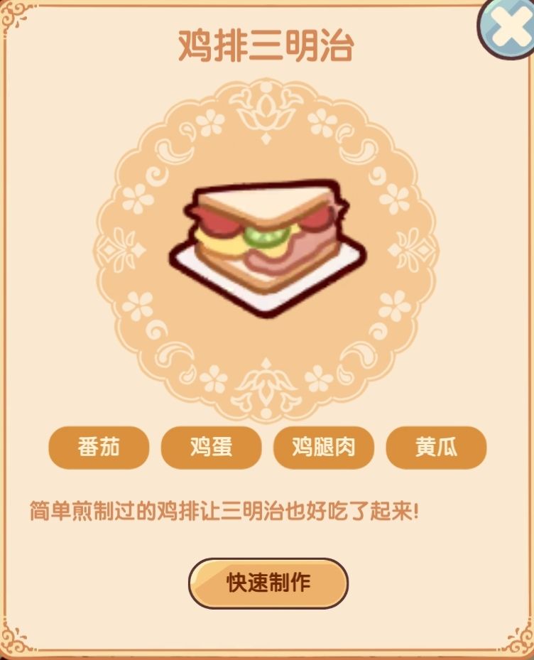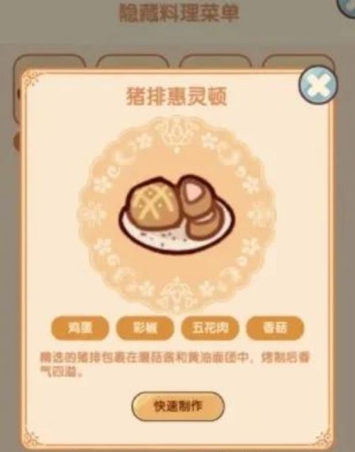 1. 了解游戏界面:初次进入游戏时,你可能会被眼前的界面所震撼。别担心,我们先来了解一下游戏的基本界面。游戏界面主要包括休闲活动区、技能学习区和社交互动区。休闲活动区包含了各种可供选择的休闲活动;技能学习区则可以提升你的休闲技能;社交互动区则是与其他玩家交流互动的场所。 我的休闲时光隐藏菜谱大全: 隐藏菜谱一:猪排惠灵顿=彩椒+香菇+鸡蛋+五花肉。 隐藏菜谱二:炸鸡柳=番茄+鸡腿肉。 隐藏菜谱三: