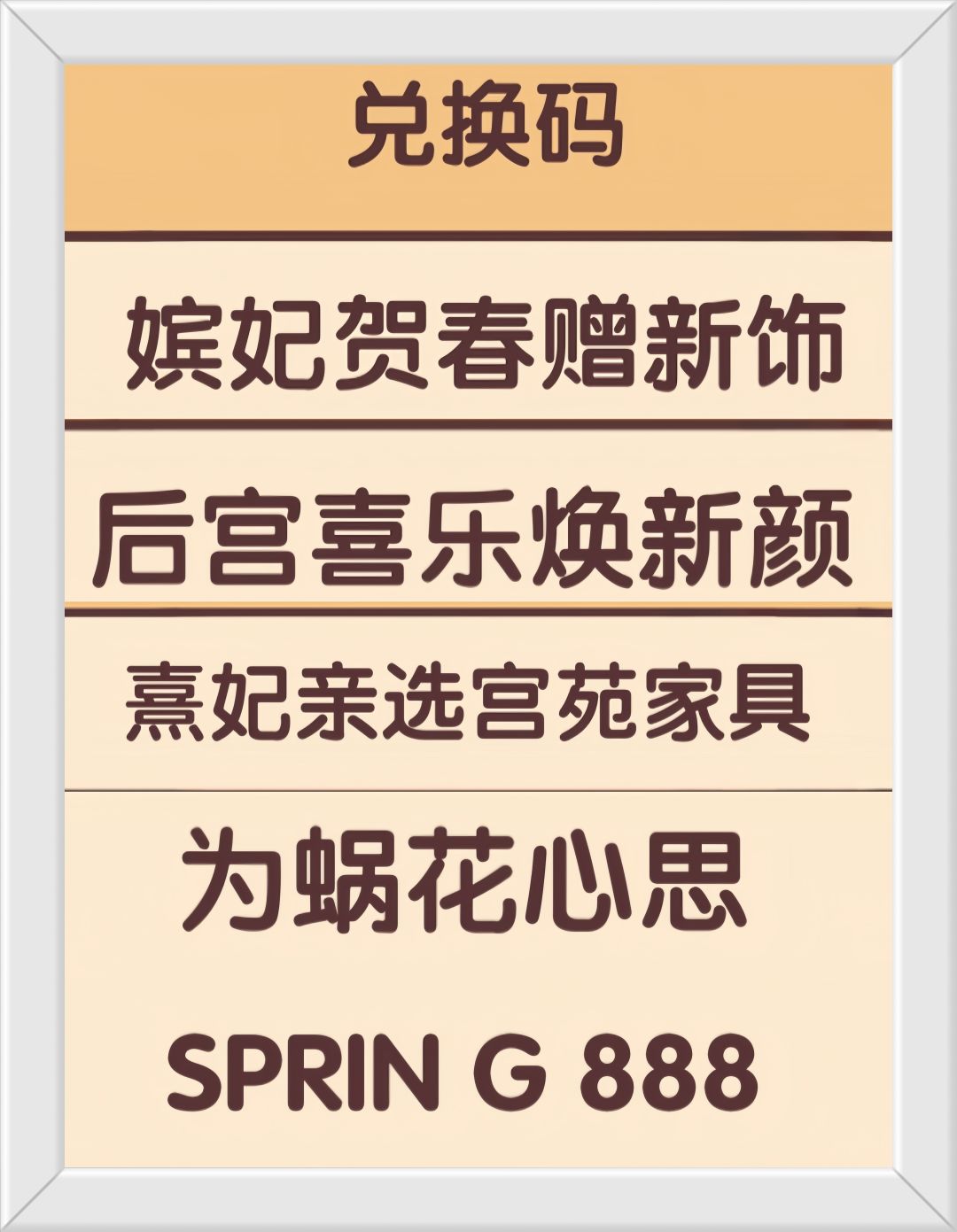 兑换码:味满佳肴聚唐楼 兑换奖励:华灯设计稿×3、蜗壳币×60 有效日期:至2月4日 兑换码:我在蜗居过新年 兑换奖励:金币×888、内嵌红叶墙灯×2、迎春红木柜×1、好柿连连迎春瓶×1、新年地毯×1 有效时间: 图⑤是游戏圈福利:100蜗壳币、金币×600、红铁皮复古电视×1 #我的休我的休闲时光 #我的休闲时光 #我的休闲时光兑换码 #我的休闲时光家具 #我的休闲时光我的休闲时光 #我的