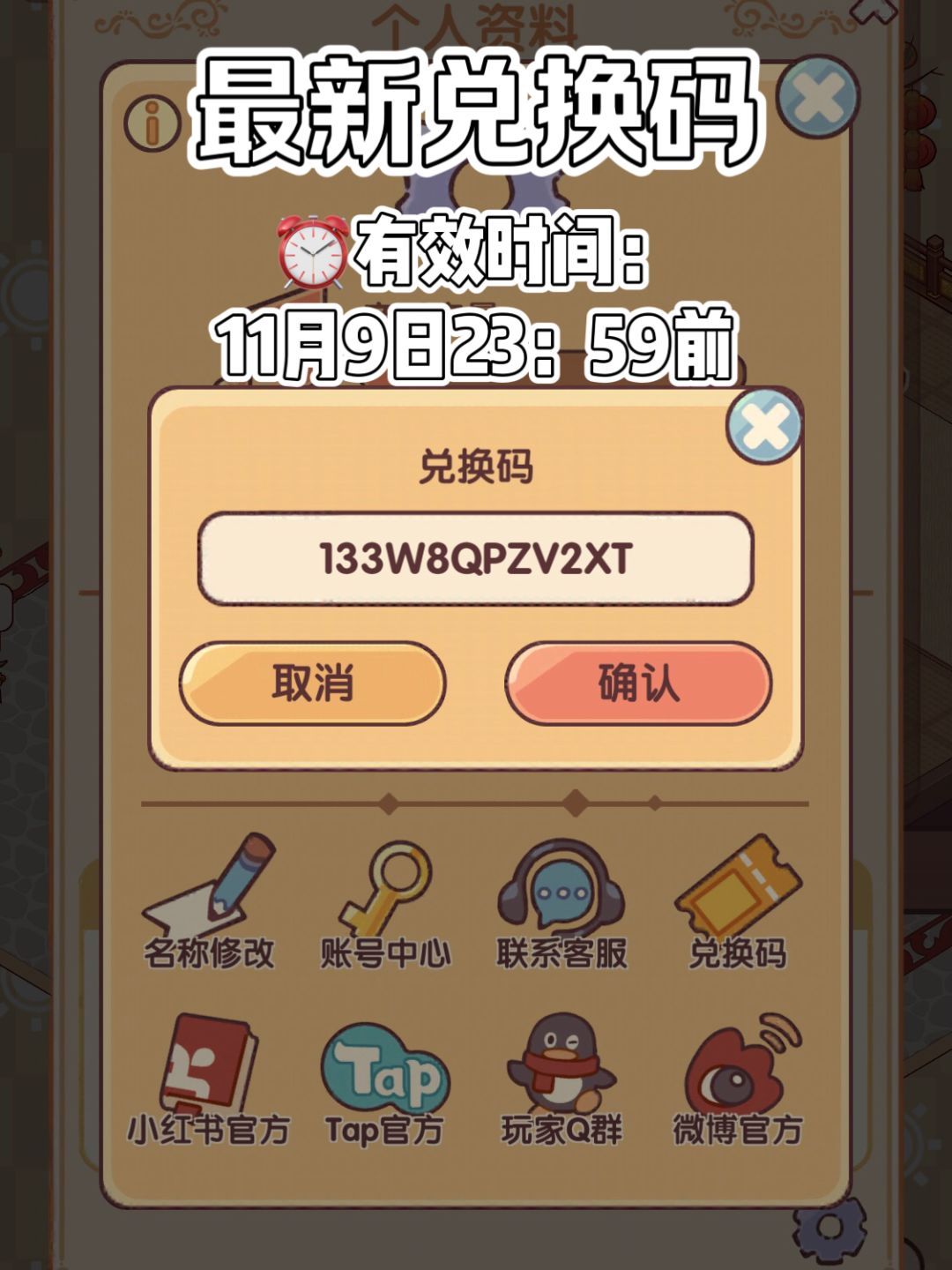 我的休闲时光最新兑换码 🎁兑换码:133W8QPZV2XT 🌟内容:蜗壳币*100、金币*666、刷新券*2、加速券*2 ⏰有效时间:11月9日23:59前 #我的休闲时光 #我的休闲时光攻略 #我的休闲时光兑换码 #我的休闲时光创作官 #我的休闲时光蜗居物语