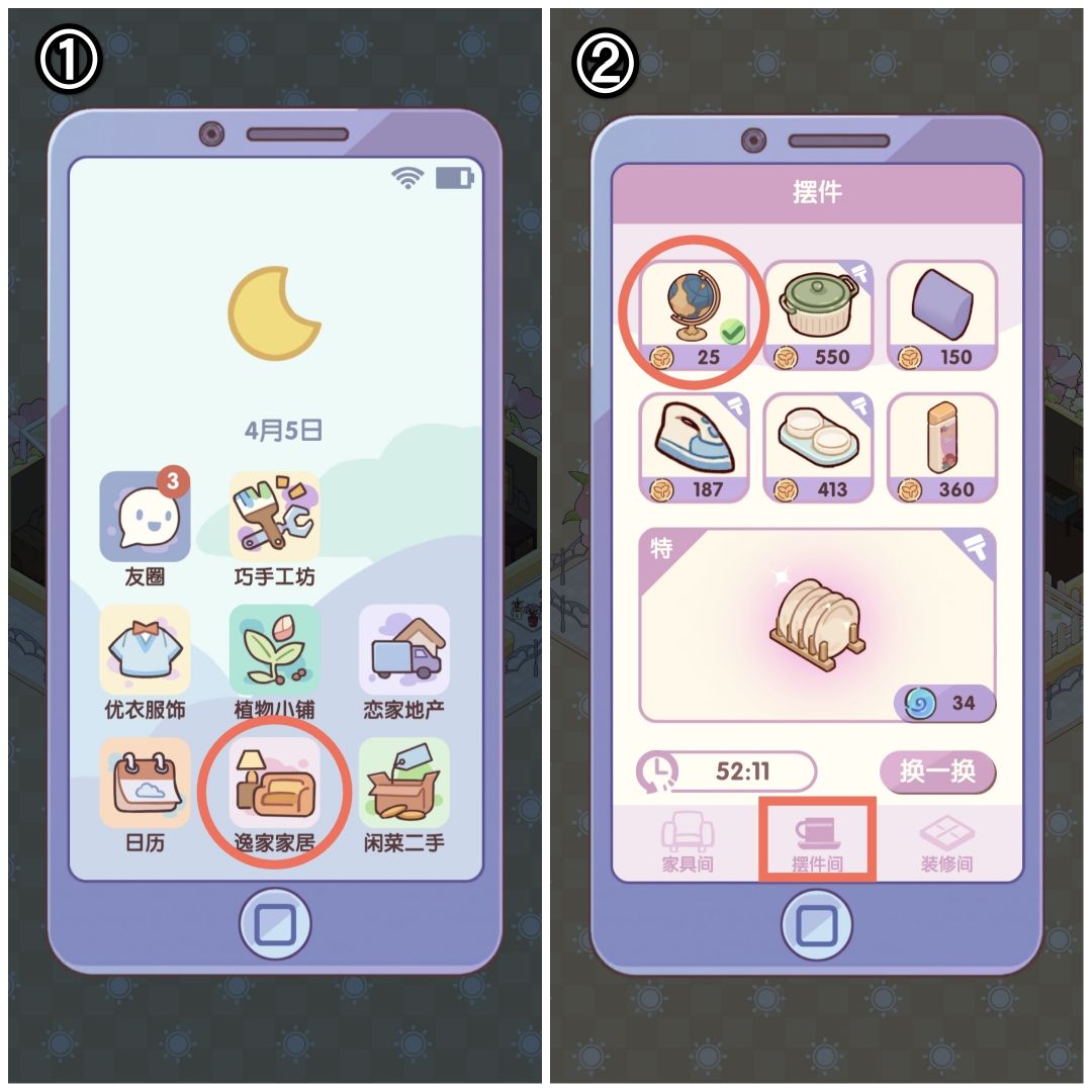 1限定池,没有限定了抽高级池,抽大概70发就行,太多如果不是特别喜欢的套装没必要。 2.等级升的差不多了,不用的家具,点开右下角手机里的咸菜二手,出售多余的家具。 3.卖出等待时间会随着价格递增,所以我们挂贵一些,看广告一键全部卖出。这样我们能最大价值获得金币 4.点开逸家家居,只购买25金币的摆件,有多少钱买多少。如果没有25金币的就用券刷新换一换,刷到为止。 5.买一个家具是5经验,不论需要花