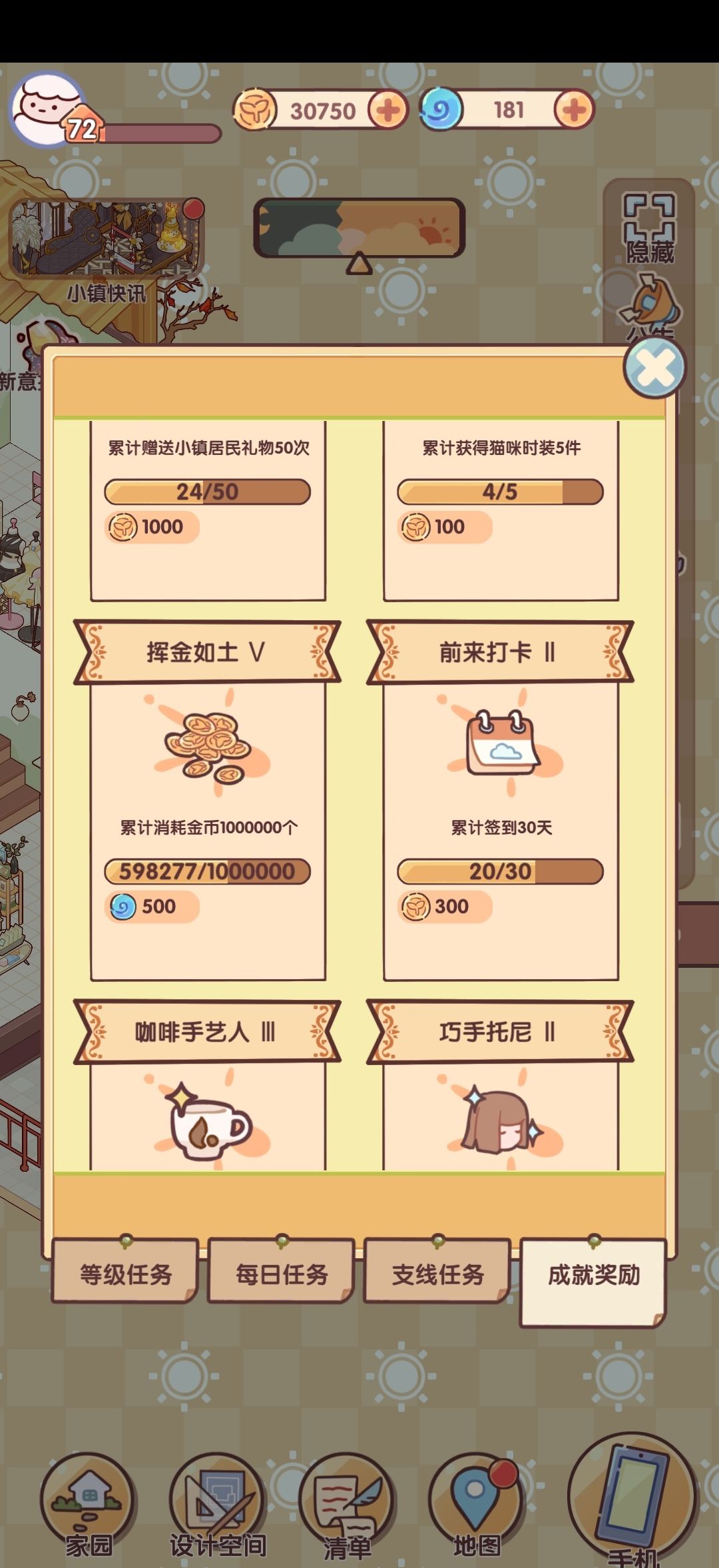 签到了20天,中间有差不多一个多星期摆烂买家具没升级。然后接下来打算不升级了,先把房型和家具买买再说。 首先就是不管是要房子还是家具还是金币都得先猛猛升级。等级越高,邮箱里的离线和在线奖励就越多,双倍给的金币就越多,这个真的很重要,双倍奖励是金币重要的来源之一(我玩到40级实在太缺金币了,不得已来搜攻略才发现这个事实……)疯狂购买25元的摆件是最主要的升级手段,然后再到二手卖掉可以回回血。 ps