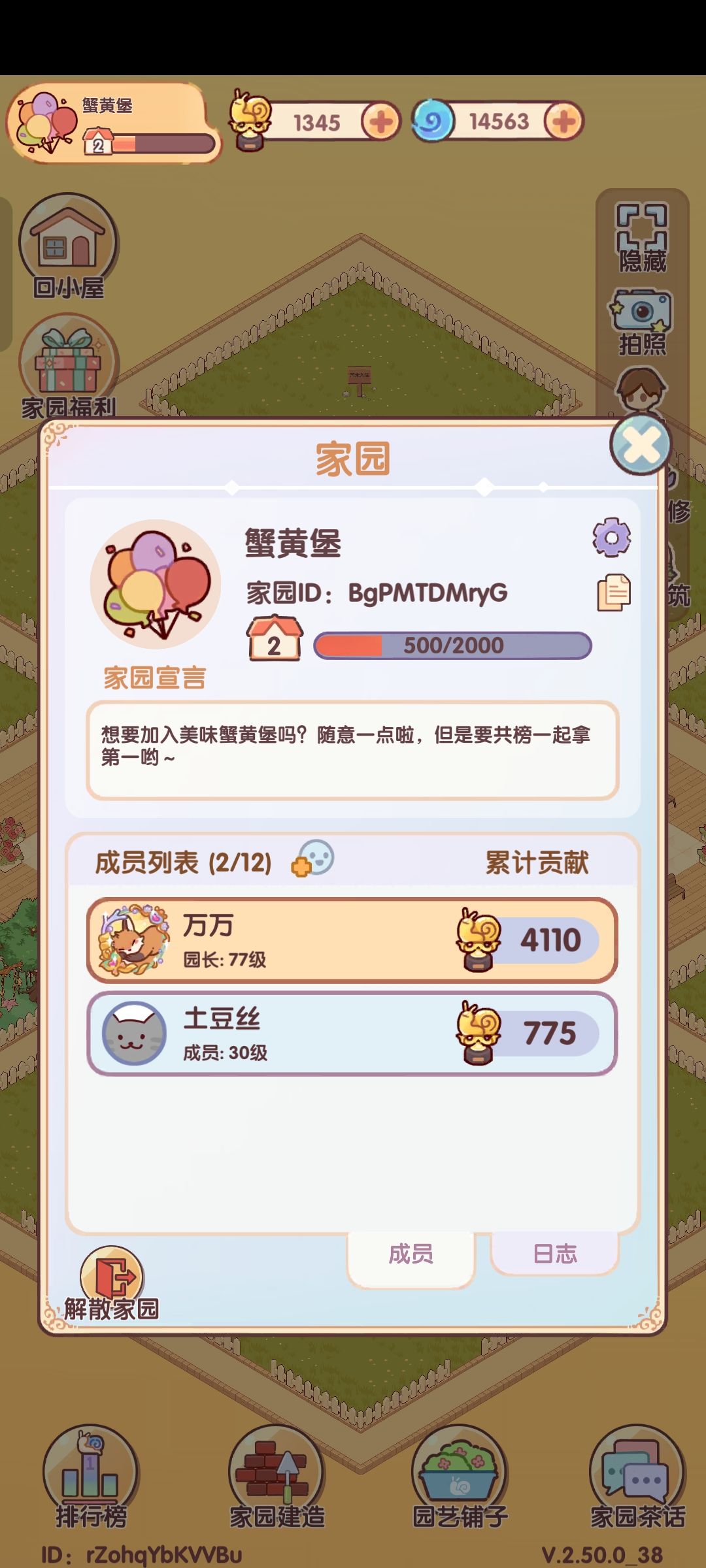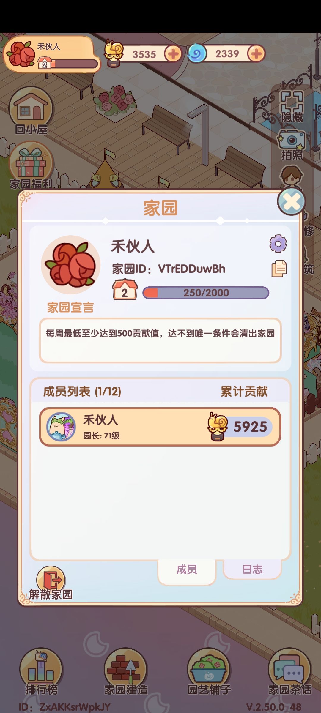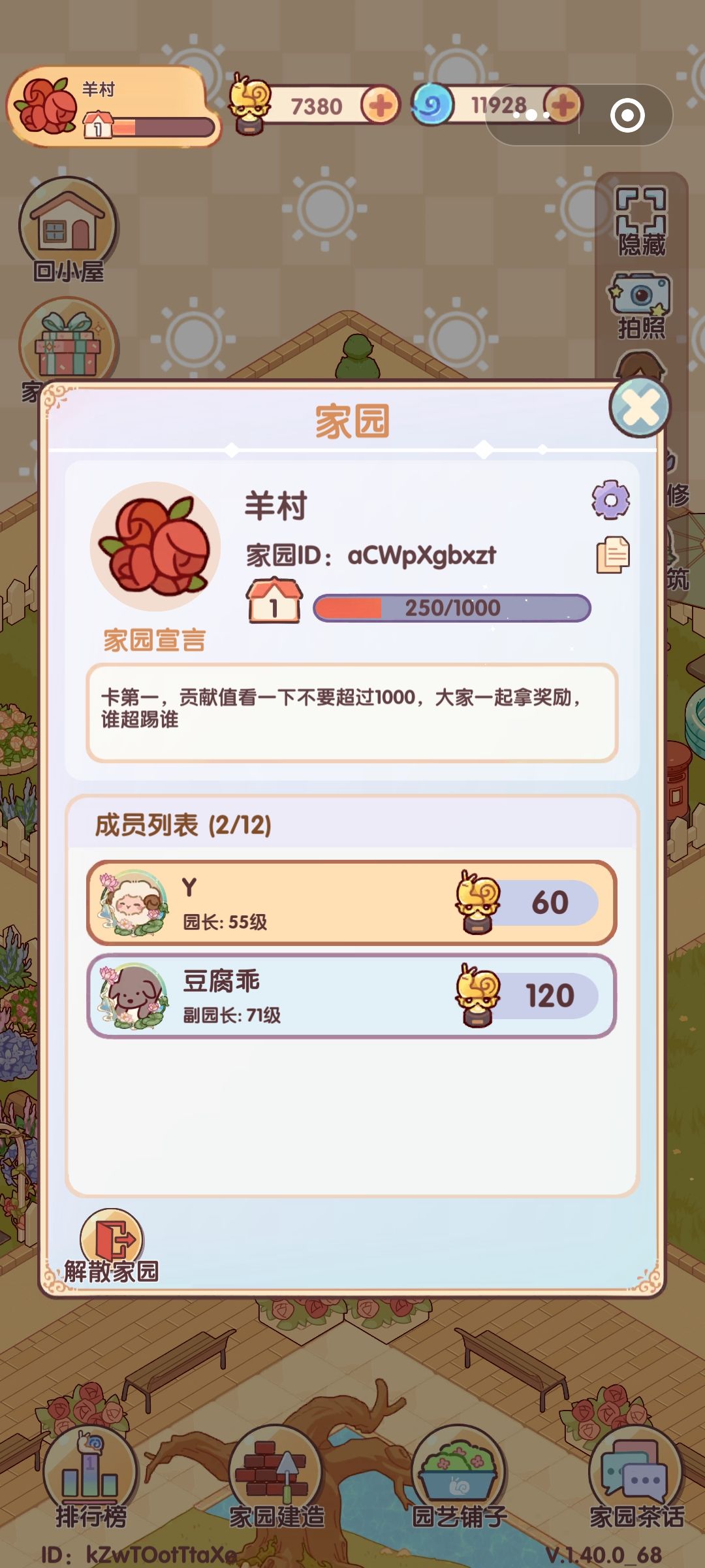 加了几个家园说好一起拿第一总做不到,自己搞了个家园玩玩,aCWpXgbxzt,没有审批秒进 贡献值算法: 互助别人一次贡献值为20,家园建造一次为25,建议控贡献值时到最后还差一百到两百的时候算一下以防误点 如果想换园艺铺子家具但因为控分没法换,可以等到周日晚上八点至十二点再进行刷贡献值换分,贡献榜每周日晚20:00结算,每周一0:00重置。 建材兑换: 如果没有建造材料可以去种菜换建材,通道在家