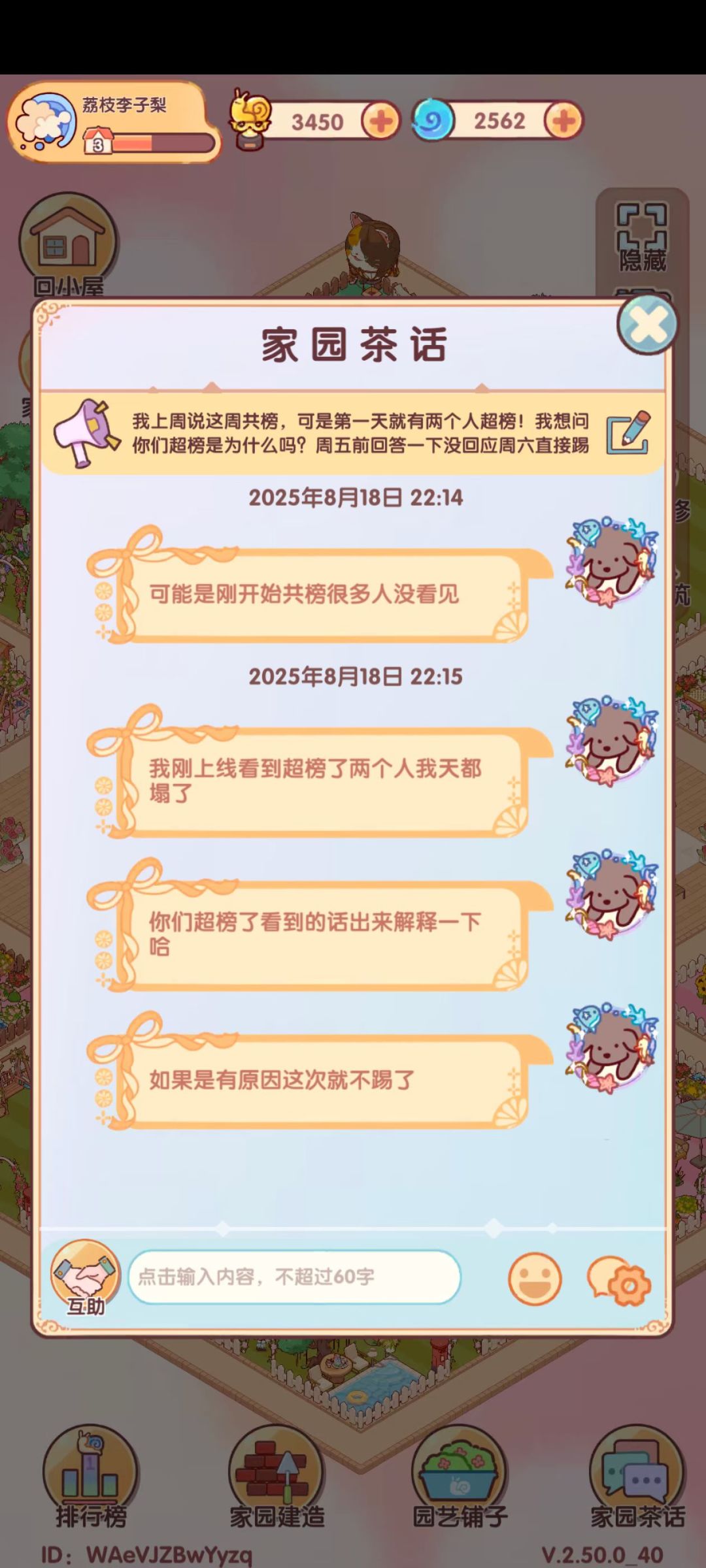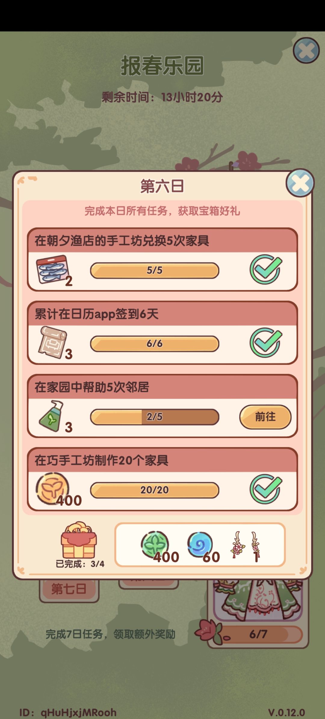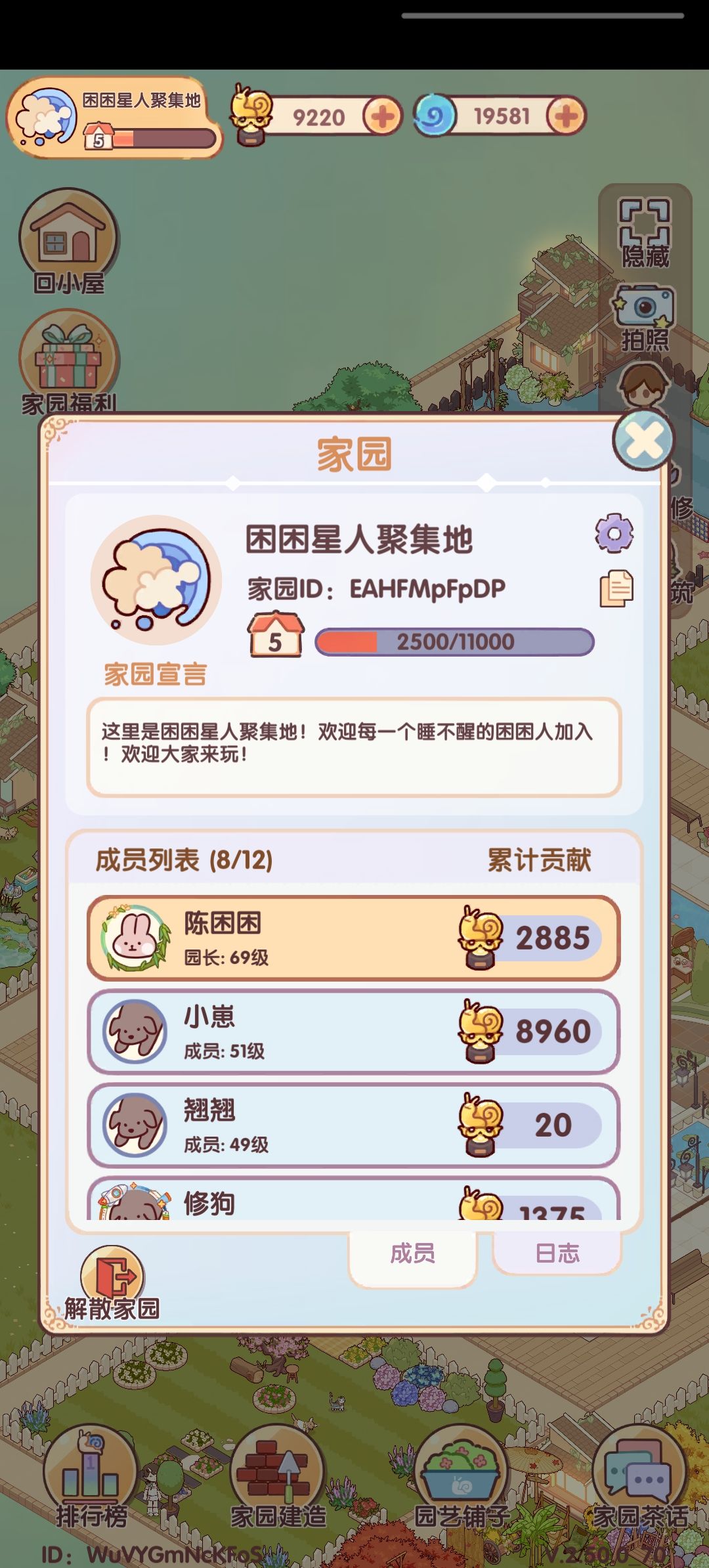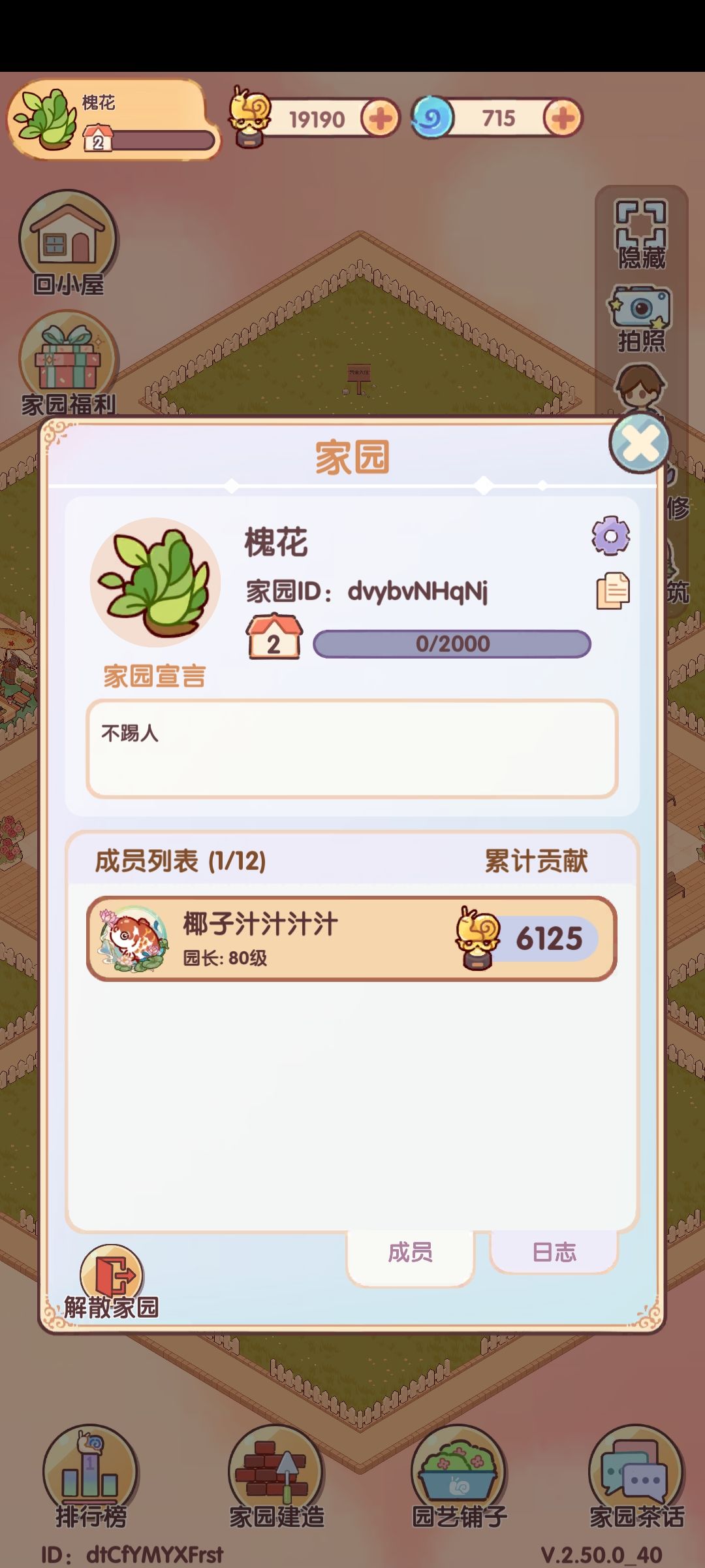 加了几个家园说好一起拿第一总做不到,自己搞了个家园玩玩,aCWpXgbxzt,没有审批秒进 贡献值算法: 互助别人一次贡献值为20,家园建造一次为25,建议控贡献值时到最后还差一百到两百的时候算一下以防误点 如果想换园艺铺子家具但因为控分没法换,可以等到周日晚上八点至十二点再进行刷贡献值换分,贡献榜每周日晚20:00结算,每周一0:00重置。 建材兑换: 如果没有建造材料可以去种菜换建材,通道在家