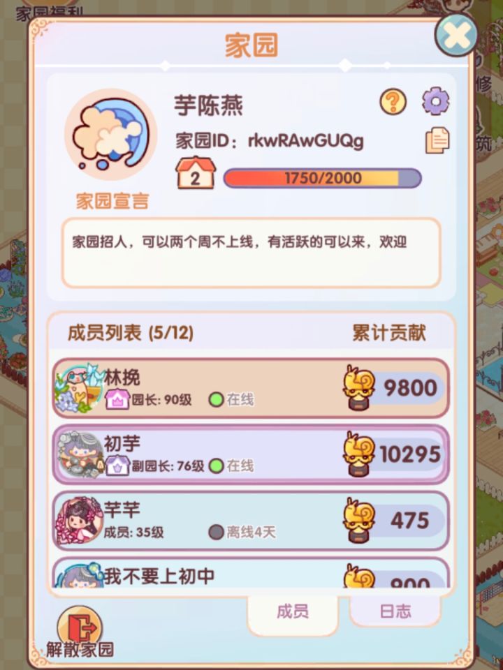 是一个小家园,不需要很高贡献值,要求活跃互助就好,可以两个周不上线,混熟了久了淡游也没问题,等级有点低,不卡贡献值,欢迎