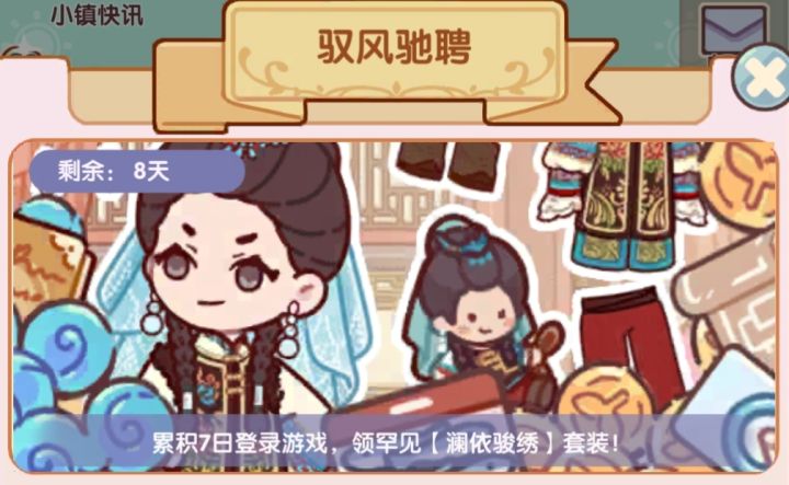 驭风驰骋活动即将上线活动于2月28号早上10点上线,活动为签到模式,可获得一整套衣服,和一个棉花娃娃摆件#我的休闲时光甄嬛激励计划 #我的休闲时光攻略 #我的休闲时光蜗居物语 #我的休闲时光