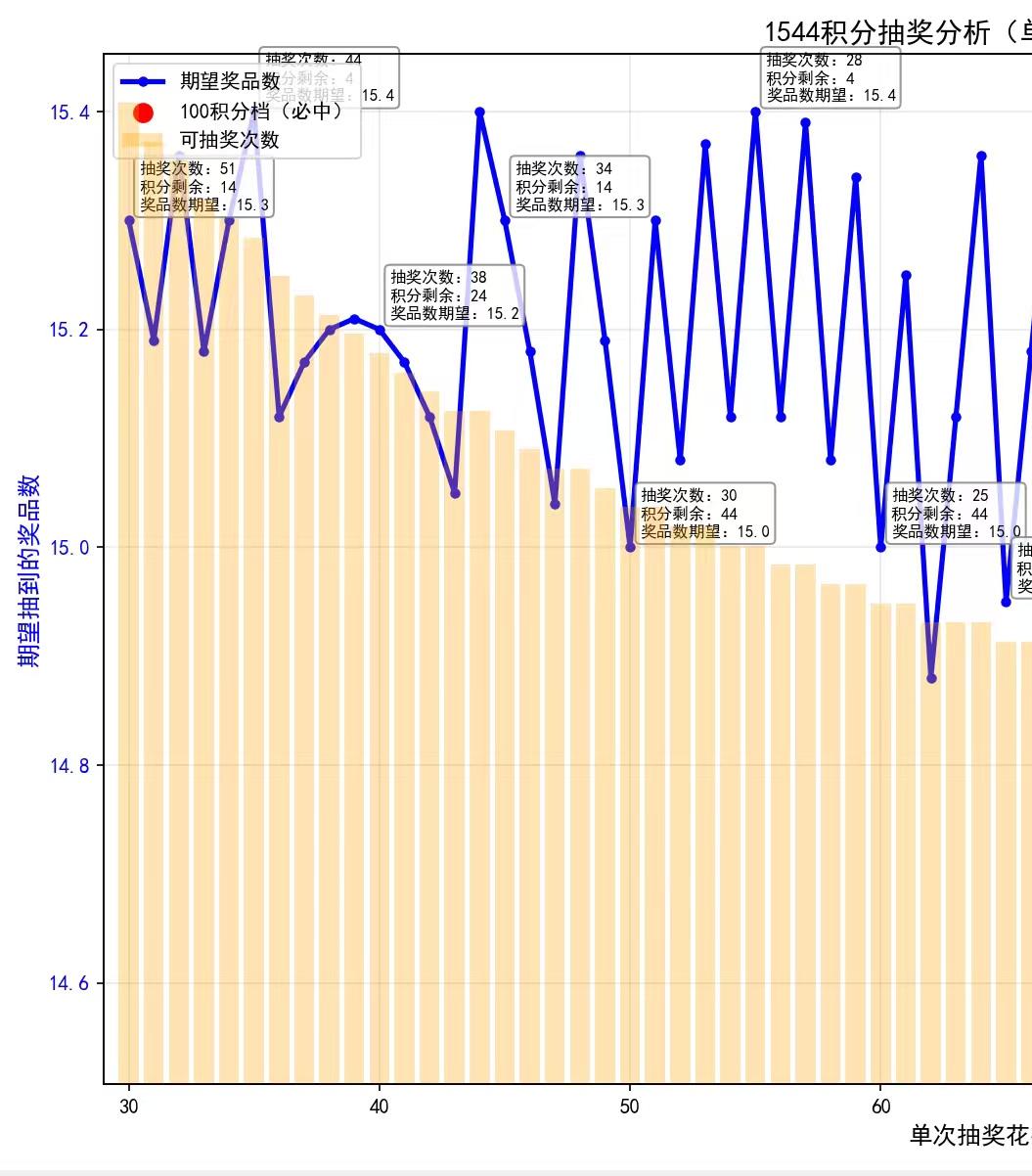 本来想玩新游,结果它鼠了,又灰溜溜地跑回来…这个是0氪的估计(1544积分的总计从论坛找的,我也不知道对不对)计算规则:每种方案是按相同积分一直抽,直到不能再抽(比如:单次抽奖30积分,在总共1544积分的情况下,能抽51次,剩余14积分,抽到惊喜礼盒数的期望是15.3个)代码是我让ai5分钟生成的,大致看了看,没什么大问题。大图太糊了,拆成了两张。惊喜礼盒数期望仅供参考,有误欢迎指正