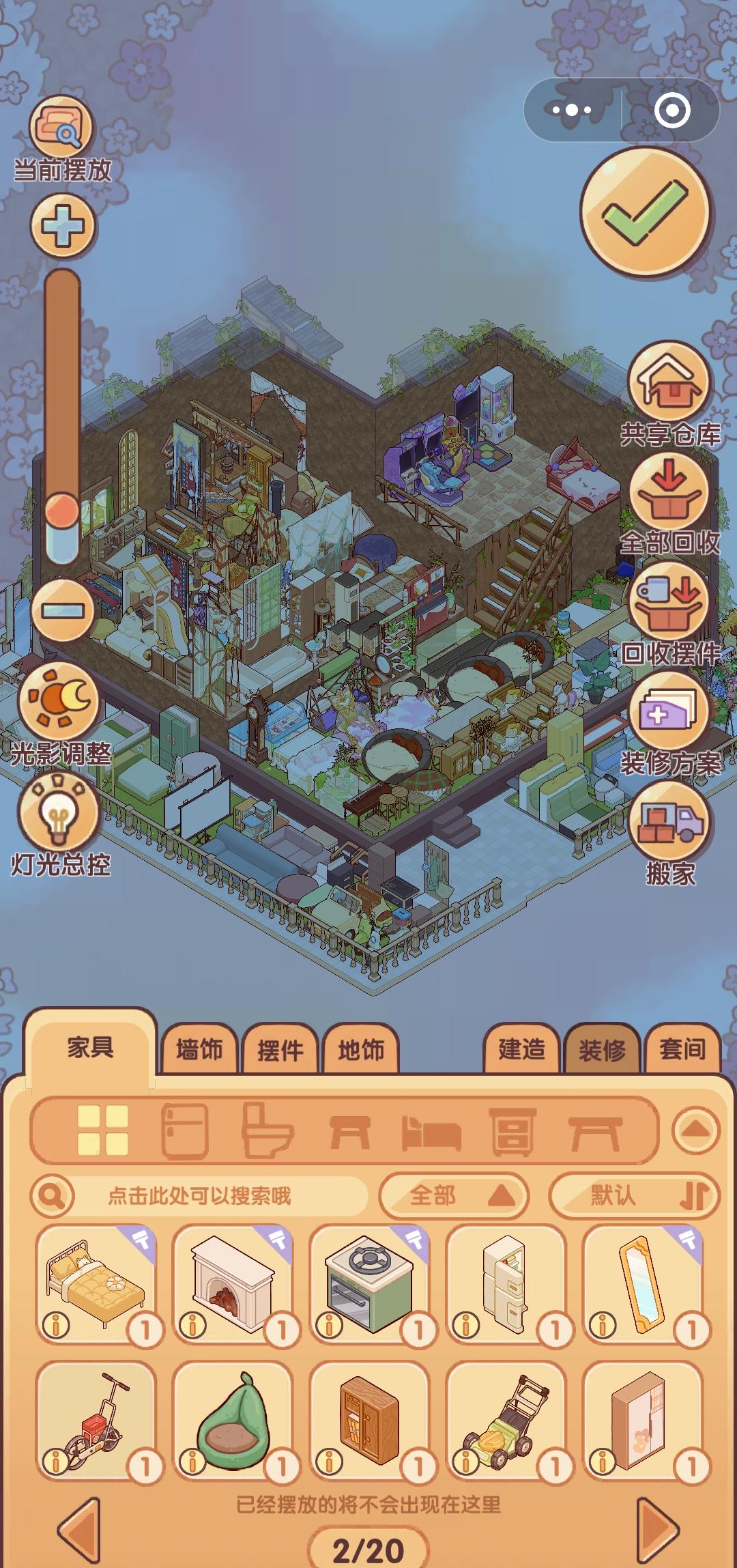 蜗居的共享仓库可不可以出一键共享的功能?刚开始发现这个我就说怎么没有家具,去搜了才发现要自己拿出来,然后我想要装修一个好看一点的双人房,但是另外一个号又没多少东西,我就一直在这个大号把东西拿出来,然后拿过的东西又没有显示,导致我只能全部都拿出来,我有4000多个家具,现在我才拿了200多个,我要死了#我的休闲时光双人空间 #