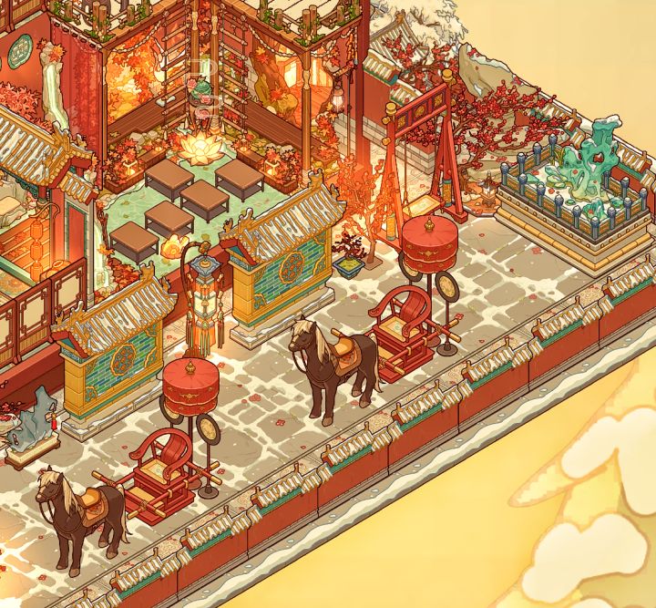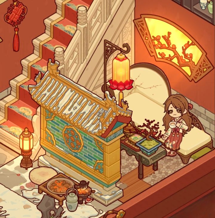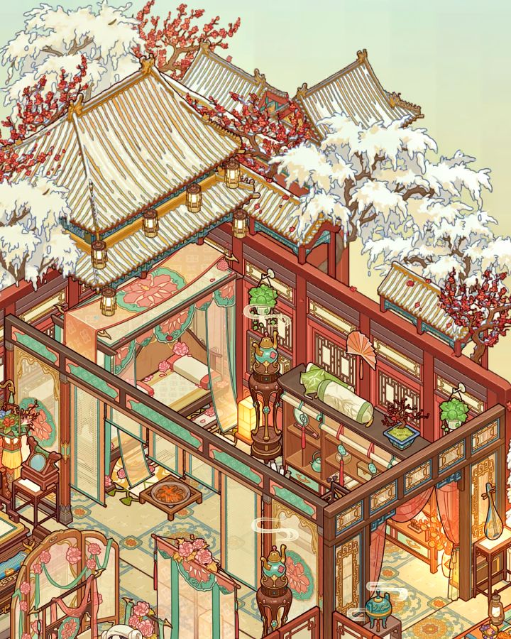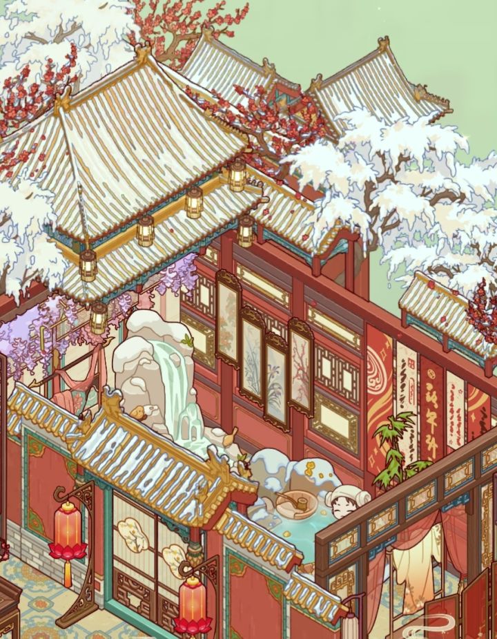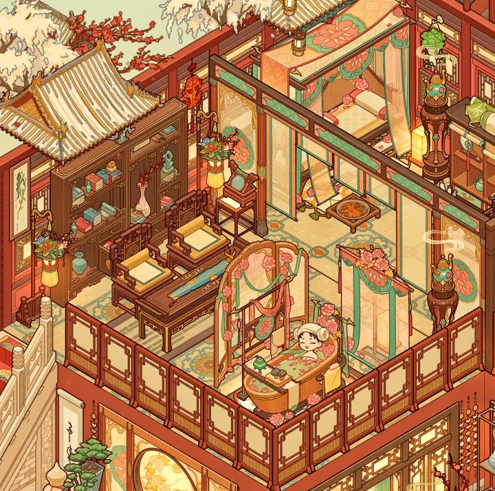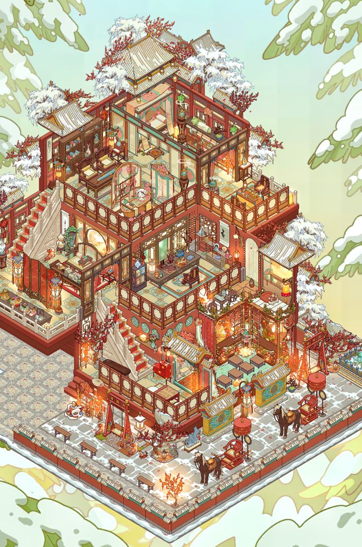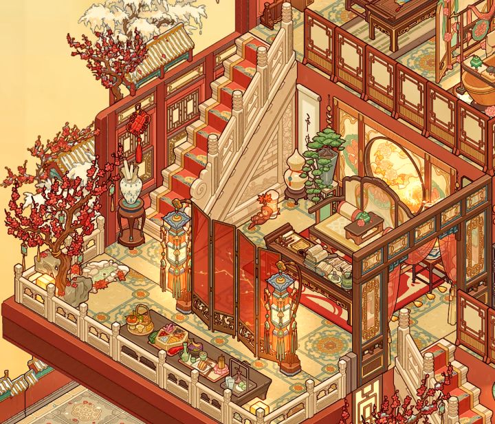 大家新年好!🧨因为我个人非常喜欢甄嬛传,这套家具果断拿下[捂嘴笑R]这次又是古风混搭!(玉案芙香、鸾凤鸣霄、瑞鹤仙居、西部驿站、枫霞瑶池等)由于云栖雅筑比较大,需要用很多的家具填满!所以各种套间的古风家具都用上了!中国红加一点绿植再加点蓝色的摆件,有种高雅的宫廷感!小阁楼自创加了个洗澡帘子间当是茅房[笑哭R]楼下是小溪水可以通向两个方位的长廊,希望你们会喜欢! #我的休闲时光我的休闲时光 #我的