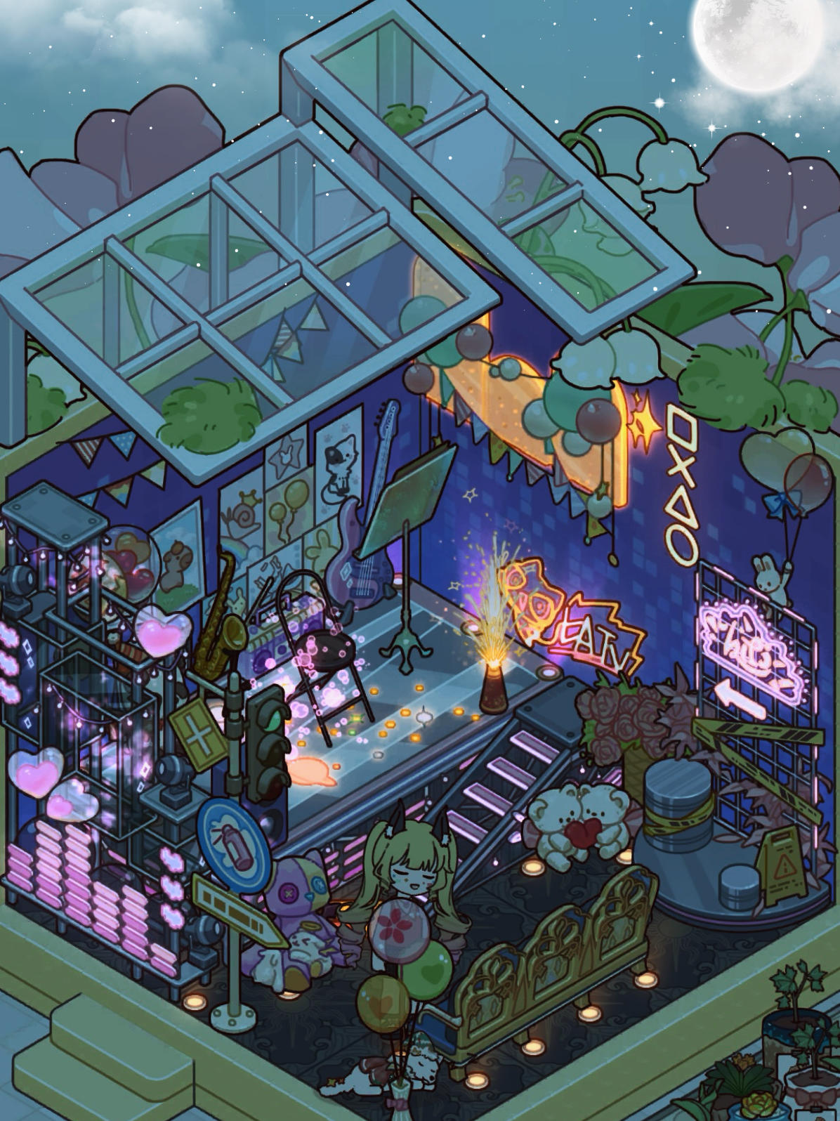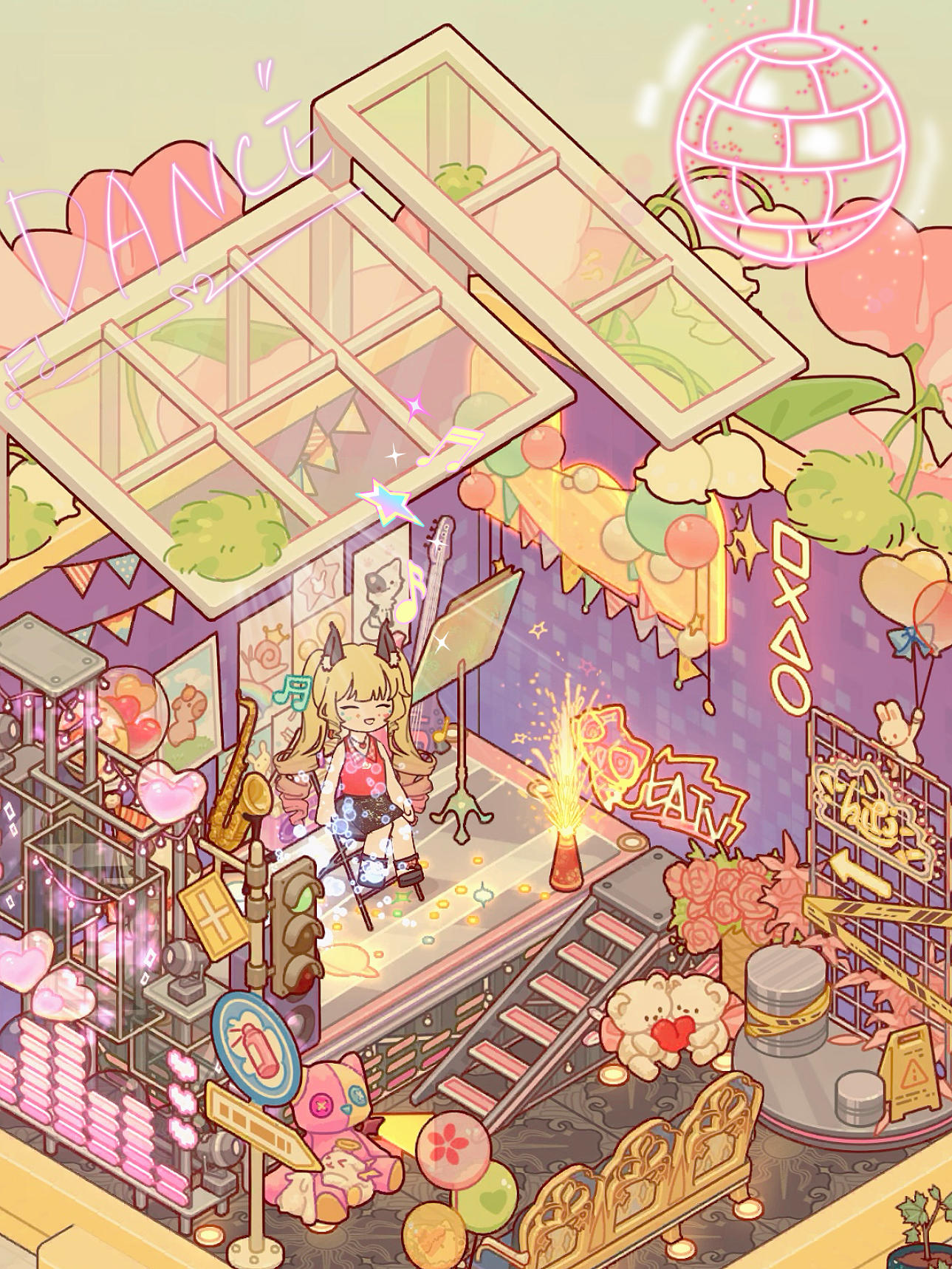 金色的毛发在白天的柔光里晃出细碎的光。她攥着麦克风的手指微微用力,粉色的兔耳随着节奏轻轻颤动,台下虽没有观众,可她的眼睛亮得像盛满了星光。墙上贴满了手绘的应援海报,角落堆着粉丝送的毛绒玩偶,连空气中都飘着甜丝丝的糖果味。傍晚的霞光渐渐褪去,夜幕像一块深蓝色的丝绒裹住了整个空间。舞台的霓虹灯次第亮起,粉紫的光映在她身上,却没再照亮她的眼睛。风从敞开的天窗吹进来,卷起地上的乐谱,她伸手去抓,却只