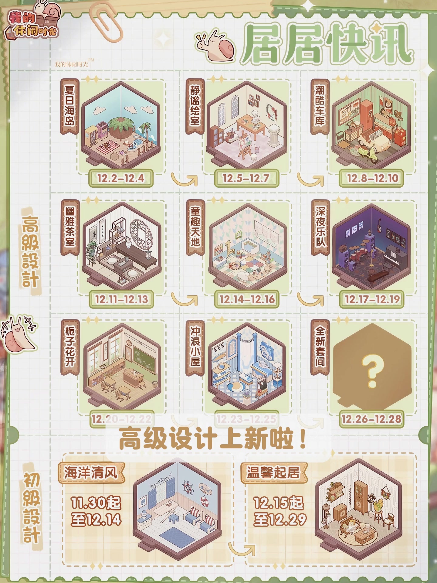 #我的休闲时光 #我的休闲时光蜗居物语 #我的休闲时光装修 ✦新的限时套间『枫霞瑶池』的关键词可以是红棕色系、自然风、户外场景,是属于秋意的自然户外家具,我个人觉得很好看。屋顶的精致度感觉比七夕的紫藤萝高一点,成片的枫叶是好看的。 ✦个人感觉这个套间整体能打8.5分,喜欢装修户外场景(自然风)和一些观赏造景,喜欢红棕色调和屋顶的小蜗可以入手。 扣分点:地板画得不灵动,浮萍和小鱼(叶子)铺得很规律