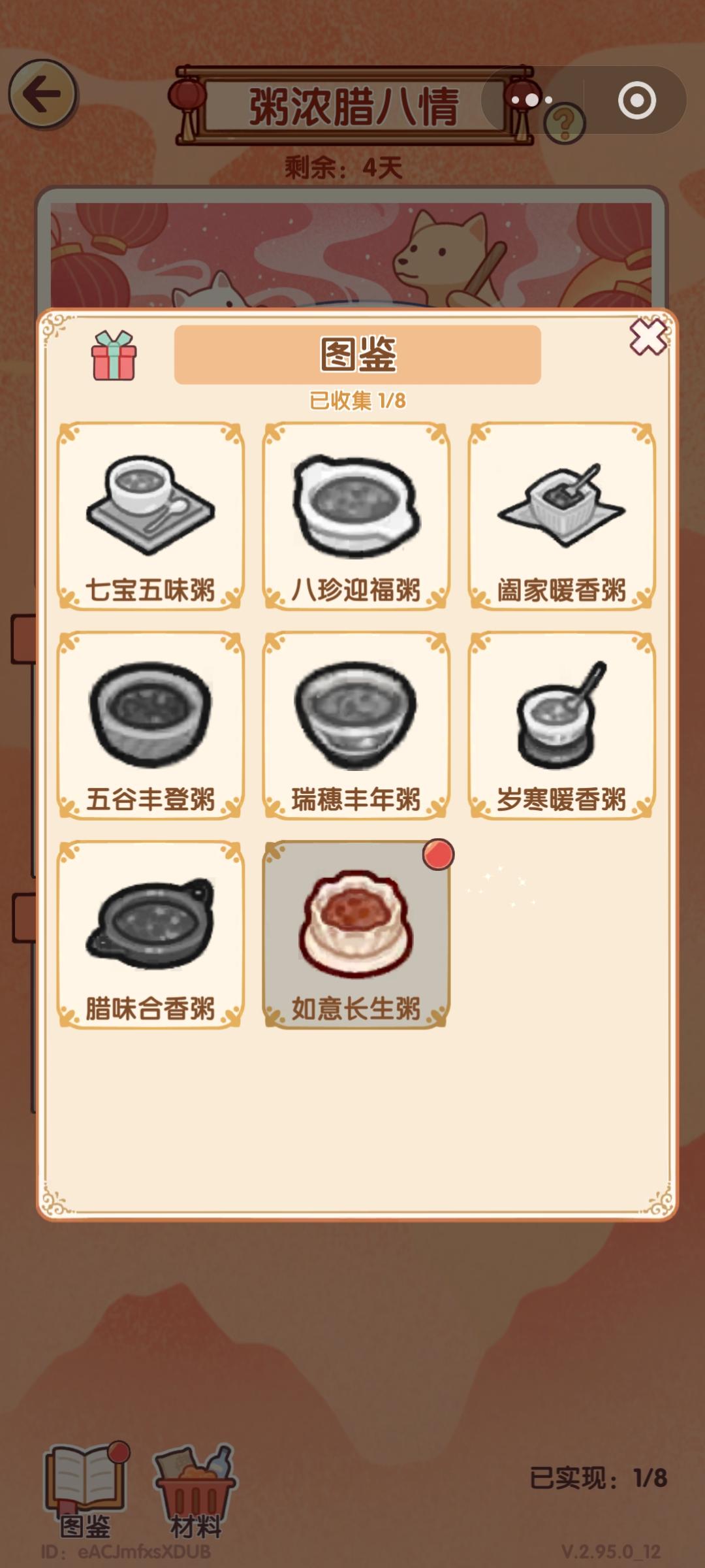 目前还剩5份如意长生粥的芸豆材料,有需要可以加我互换,最好是长期活动伙伴,偶尔会做赠送任务,我编号:eACJmfxsXDUB