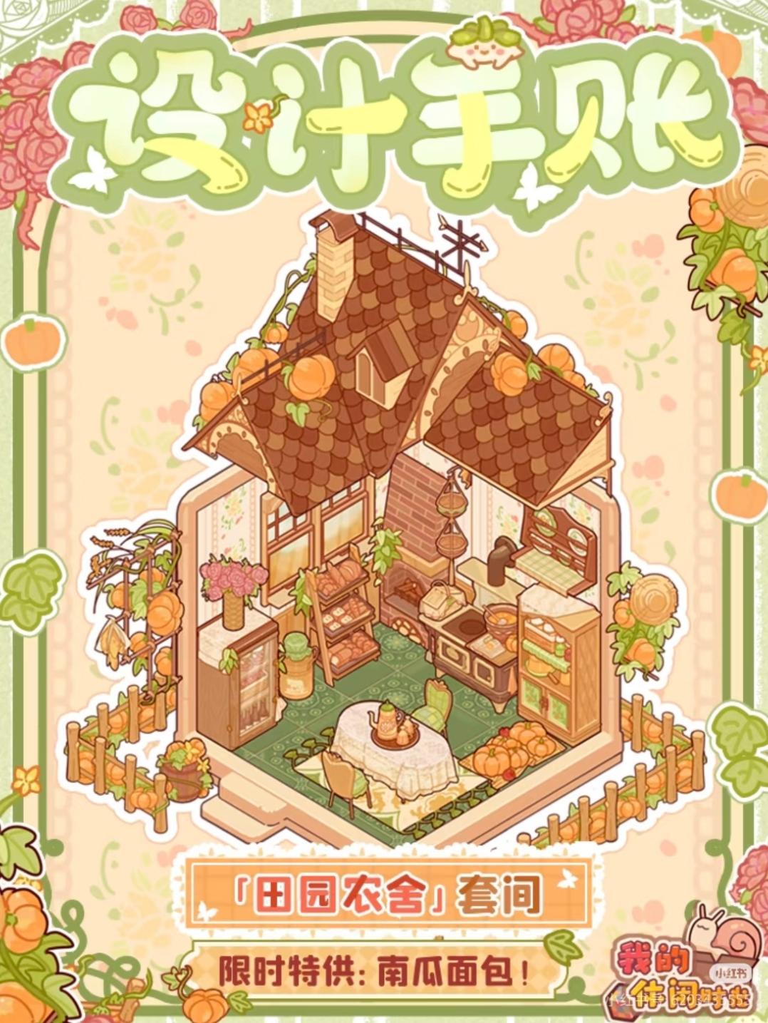 ⭐️设计关键词:温馨、田园风🍞浓郁的麦香与清甜的南瓜香交织缠绕,新鲜出炉的面包们被整齐地码在架子上,午后的阳光为其涂上一层金黄的蜂蜜,诱人的色泽惹得来者垂涎三尺;顾不得烫嘴了,赶紧抓起“啊呜”一大口,享受美味在口腔中爆炸的快乐吧~「田园农舍」套间即将于1月17日限时返场!今天给各位小蜗带来的是「田园农舍」套间的设计手帐,部分家具还新增了互动效果,快跟居居一起近距离欣赏套间细节吧!🌱居居小Ti