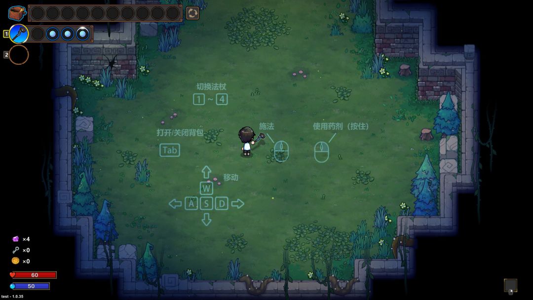 推荐使用键鼠进行游戏,如果是FPS也用手柄玩的玩家,那可以考虑手柄。 WASD控制人物角色移动。(常规的W向上,S向下,A向左,D向右) TAB键可以打开关闭背包。 E键可以进行交互。(人物对话,触发一些场景物品的功能等) 数字键1~4可以用来切换法杖。 Z键和X键可以用来切换药水。 空格键可以施放主动技能。 鼠标左键施放当前选中法杖中的法术,可以长按不放,冷却过后魔法值足够会自动释放下一轮。 鼠