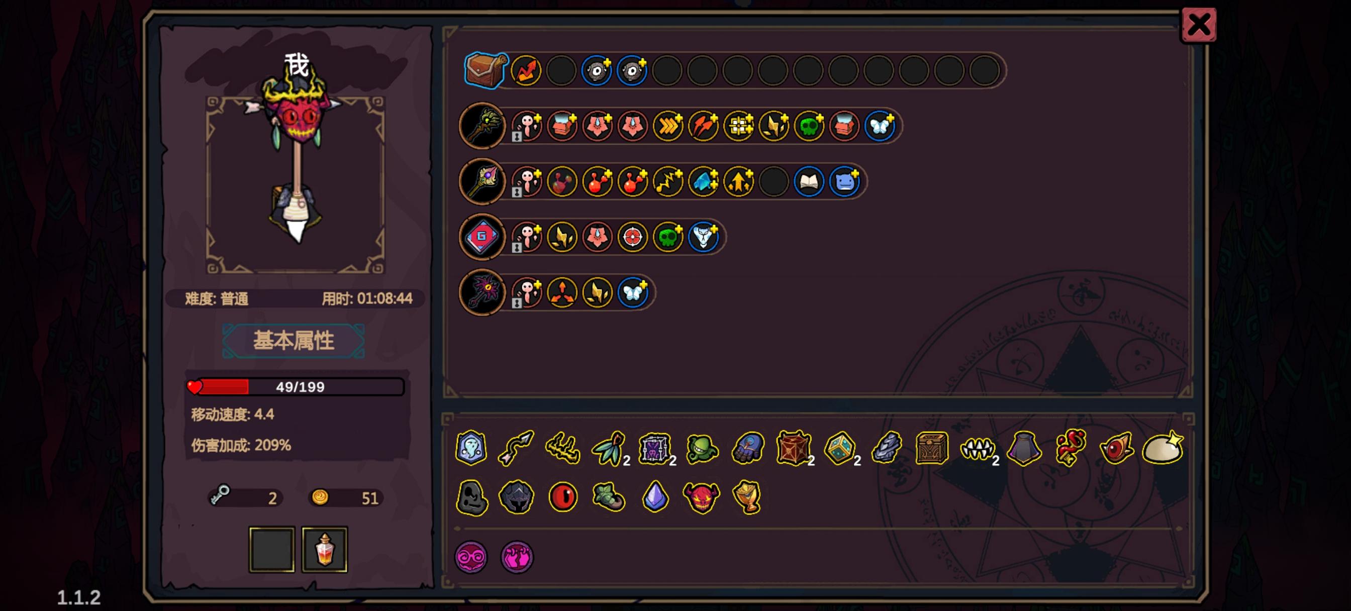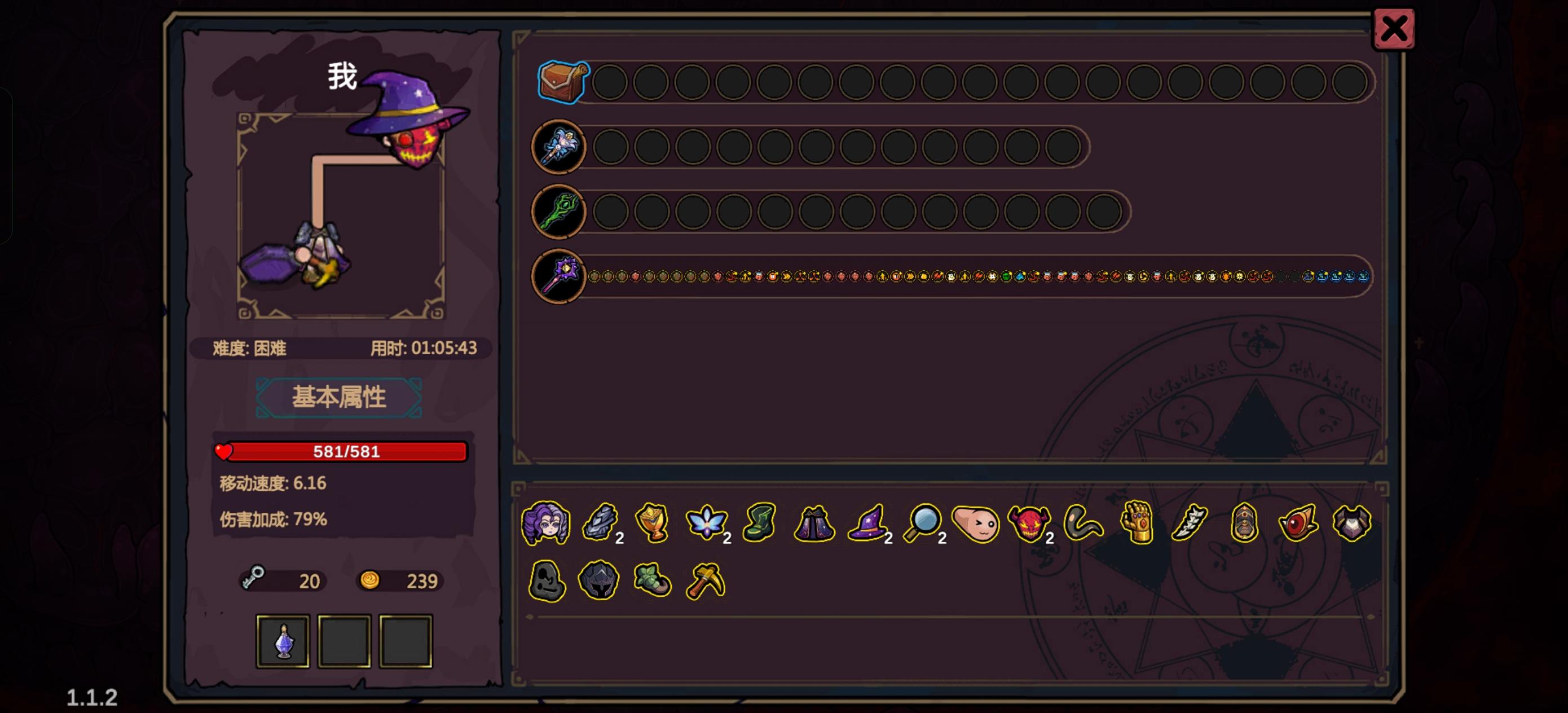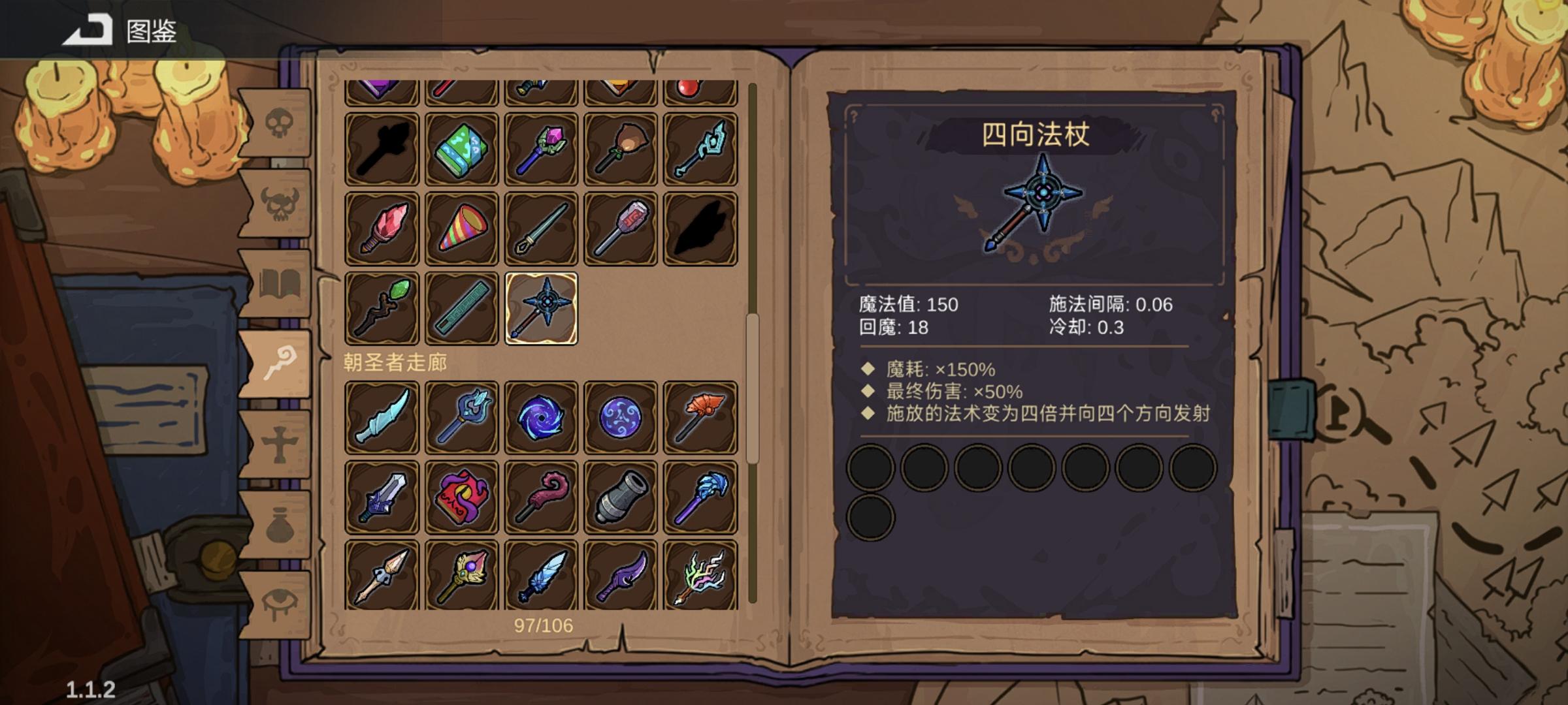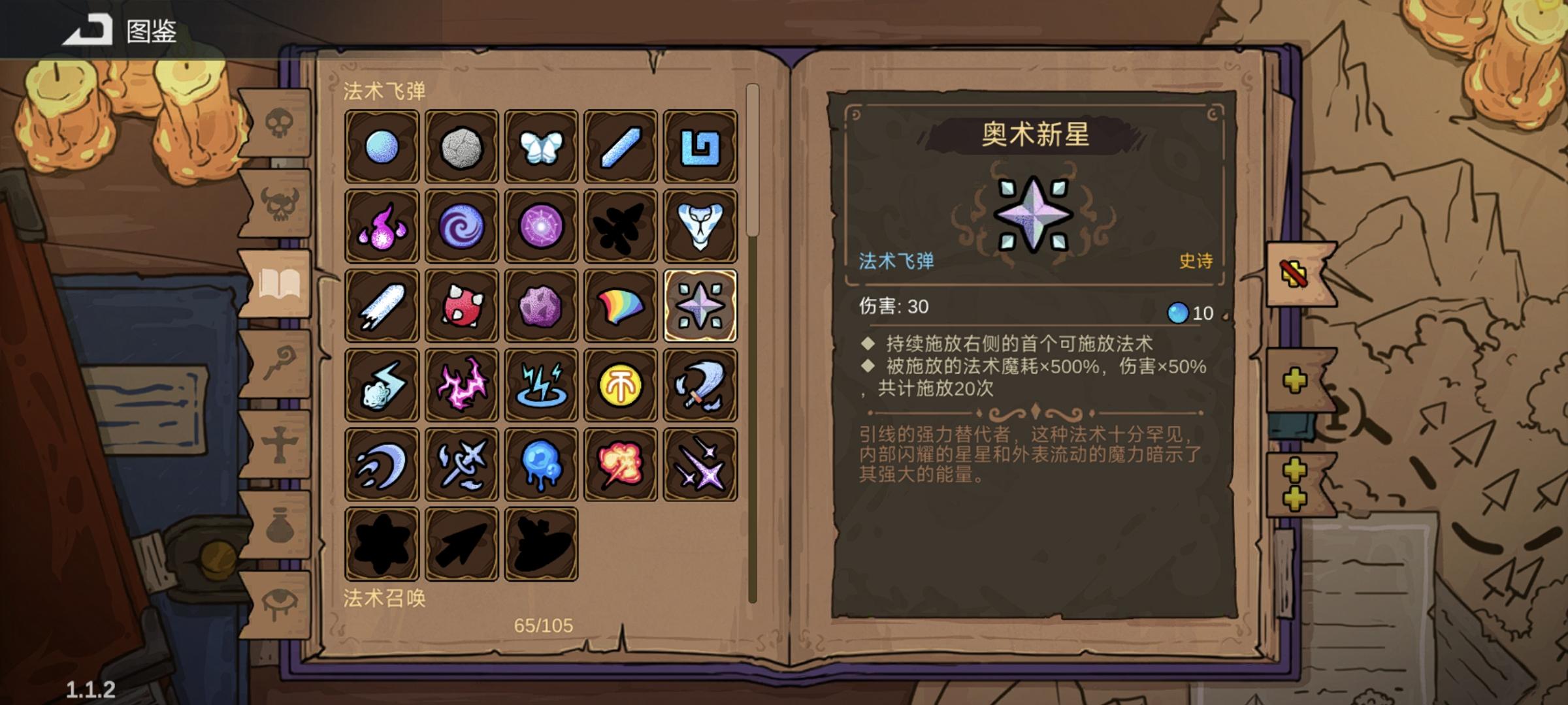 看到一串公转了吗?对,公转是加法术持续时间效率最高的(时长强化是什么垃圾),而闪电疾行持续时间内又无敌,所以这一转就是五十秒的无敌(我转起来了!)然后搭配上两个移动充能的法杖,一转就是全屏的弹幕。低能耗激光配合绚丽烟火,触手翻了四倍。再搭配上寄生虫和融合召唤,满屏都是蛆在爬。四角法杖是用来过度的,需要的话可以换成那些命中就充能的法杖,施法充能比命中充能弱很多,毕竟命中是可以靠分裂、穿透叠的。然