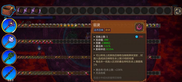 本来更新的时候就想做巨灵攻略,不过玩了两天觉得巨灵实在一般,前期完全没有刷子游戏的爽感。首先巨灵没有其他玩法,只能硬硬实实的玩叠血流,跟二柱子和虫巢一样,金币流就别开腔了,一泡屎都能秒,首先说一下巨灵的核心机制,巨灵杀怪涨暴击率和生命上限,可以把召唤物当炮弹打出去并且作为炮弹的召唤物血量越多它伤害就越高,伤害倍率额为炮弹生命值的十倍,那什么适合作为它的炮弹呢,答案就是它自己,你只需