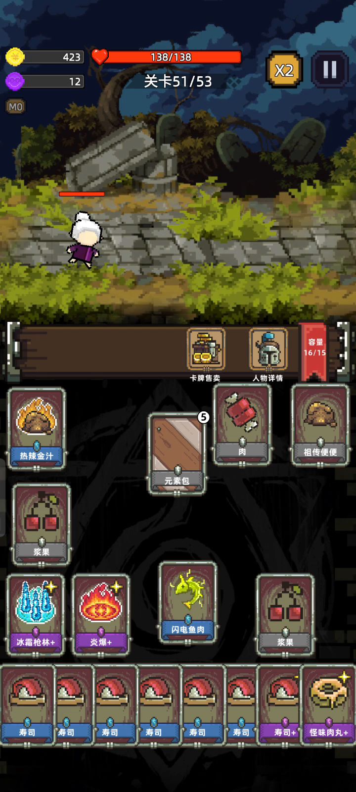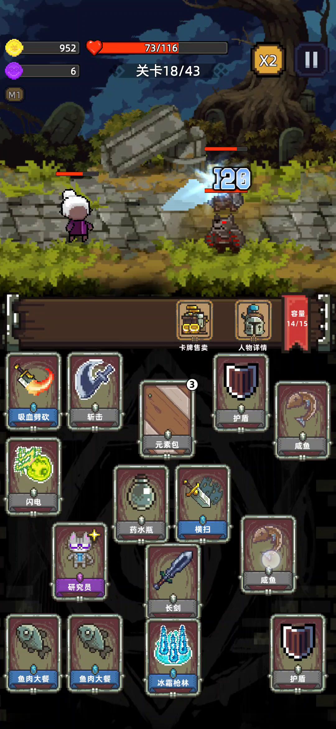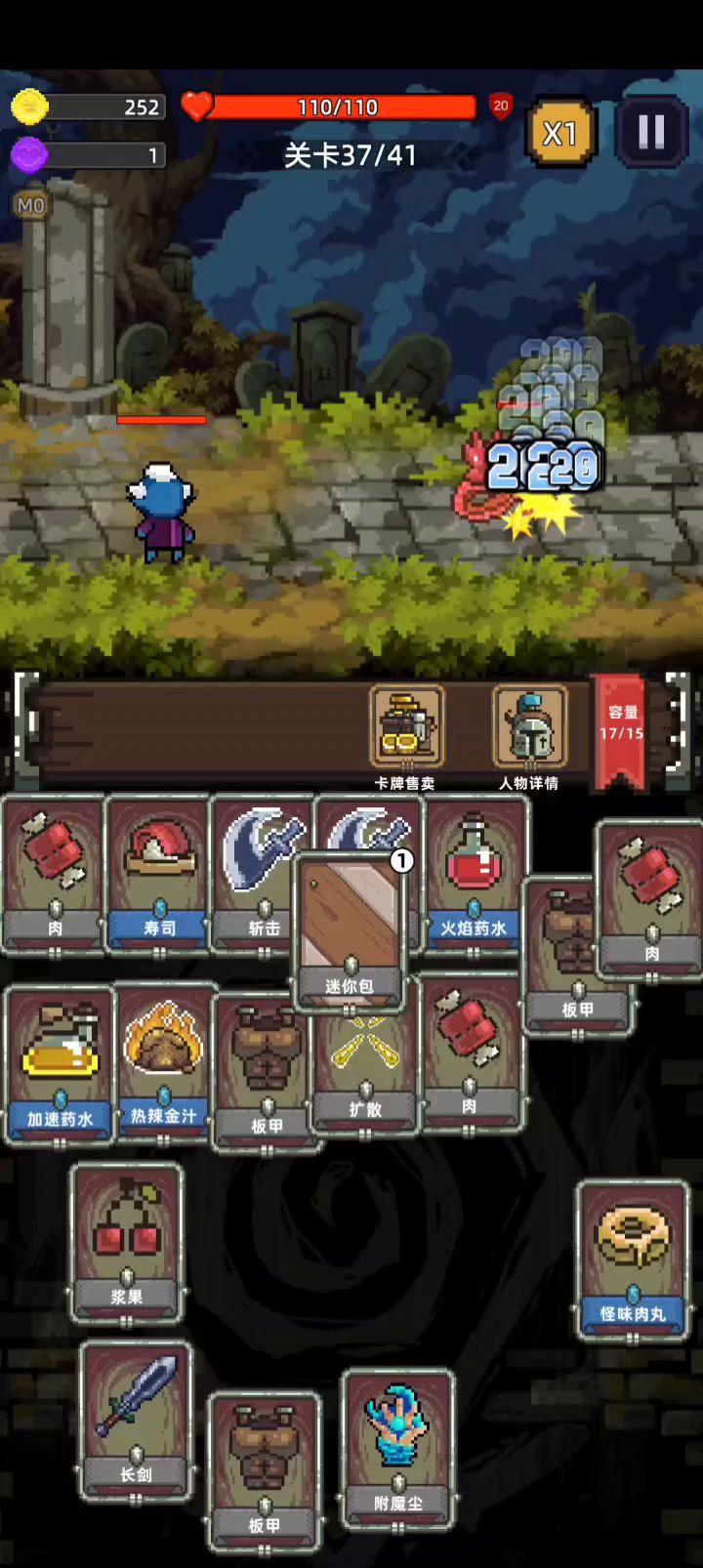 40多的攻击力,卡包根本开不完,推荐大家合成怪味肉丸回血賊多,属性最好是加攻速或攻击的不是就换,盾牌最好用紫色的,扩散少用,有8个盾通怪打你就0伤害,留单体伤害高的道具打精英怪。