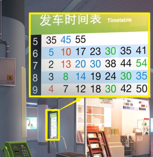 第五章 (小狗🐶) 1.(右边场景)触发剧情,获得【月票夹】 2.点击售票处,获得【钥匙】 3.(左边场景)点击电箱,用【钥匙】打开,打开显示屏2和3的开关 4.点击查看发车时间表 5.(右边场景)点击查看电子显示屏(普通:07:02、特快:07:13、高速:07:20) 6.点击售票处的售票口,根据上面的提示(普通→特快→快车→普通→高速),结合电子显示屏上的线索(普通:07:02、特快:07: