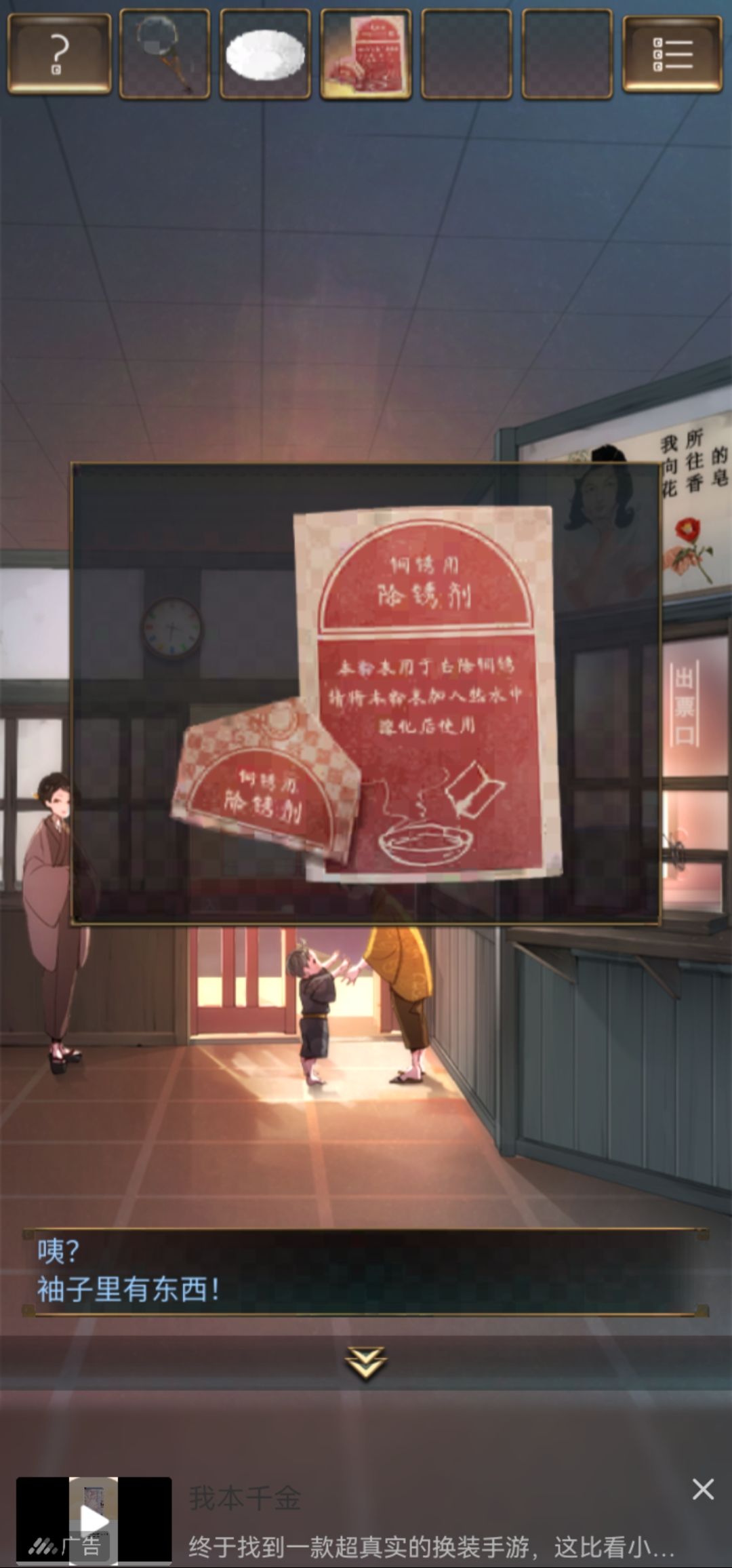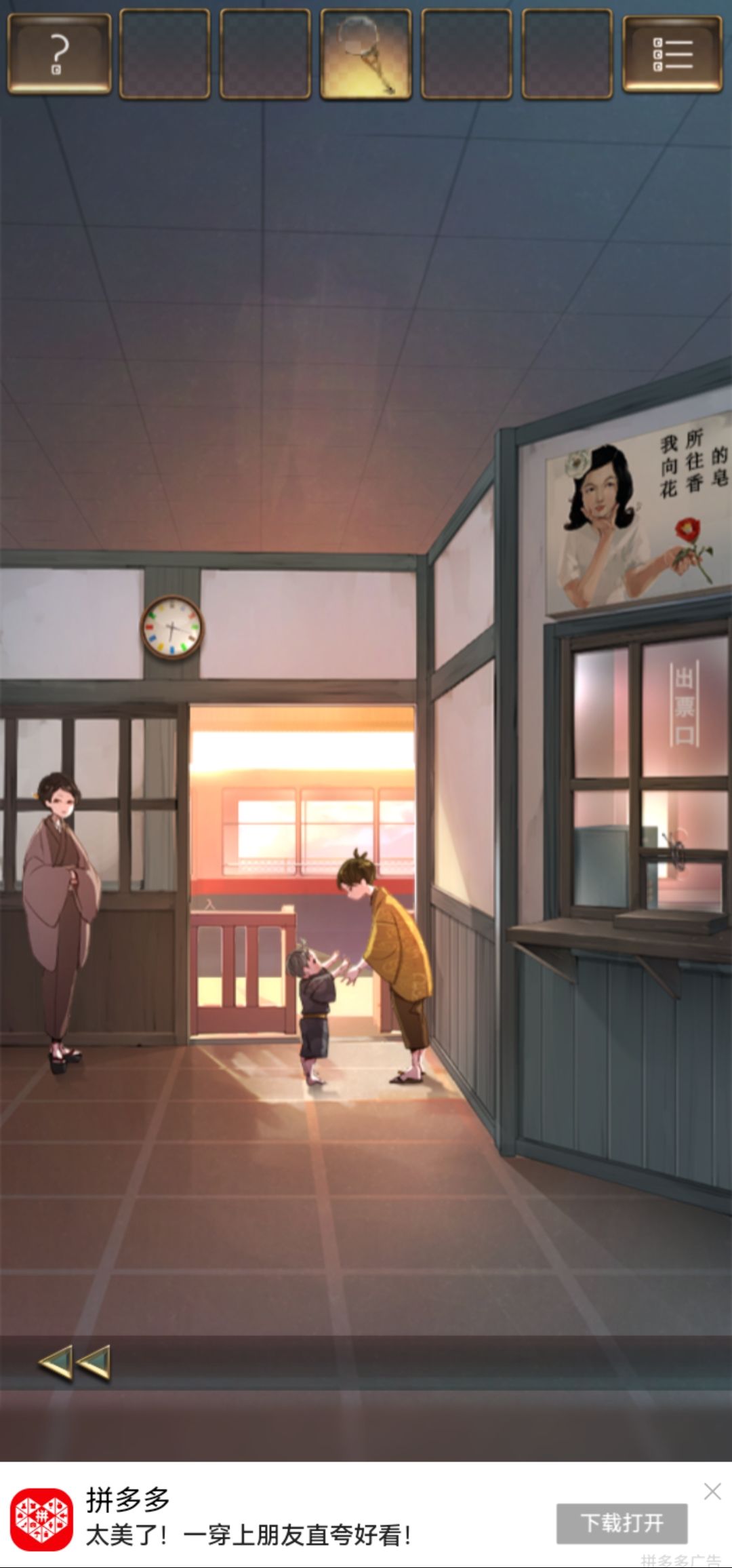 攻略作者:迷失攻略组-longma 未经许可,禁止转载,侵权必究! 第一关 1.拾取地面盲人道上的【纸片】,并记住纸片下面盲人道红框中圆点的图形位置。1 1.1 2.向左移动场景来到候车厅,拾取椅子上的【宝箱】,盒子下面获得【纸片】,并获取角落的【扫帚】。2 3.向右移动到火车道旁,使用【扫帚】获取房顶的【纸片】。3 4.双击物品栏中的纸片,完成拼图,记住拼图上的中空图案。4 5.向左来到候车厅,