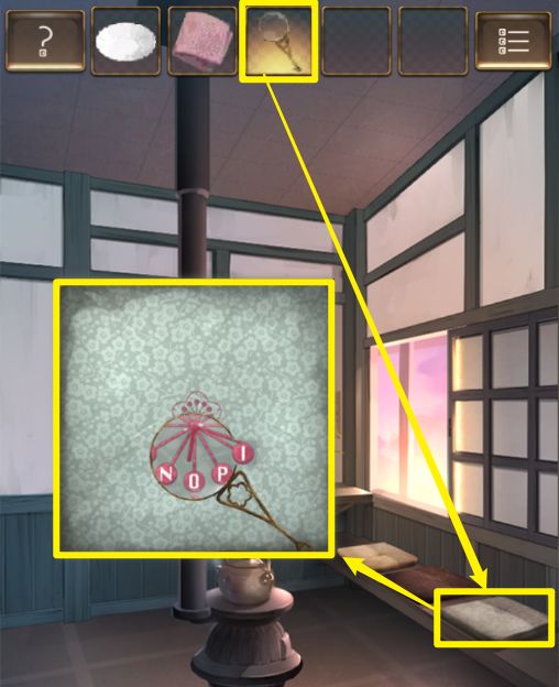 第三章 (钱💰) 1.(右边场景)点击出票口,获得【小盘子】 2.(左边场景)点击坐垫,在左边的坐垫下获得【放大镜】 3.在中间的坐垫下获得【毛巾】 4.用【放大镜】查看右边坐垫上的图案,获得线索:NOPI及红色夹角 5.点击热水壶,使用【毛巾】,用【小盘子】装热水 6.点击窗台上的花,移开,点击查看墙上的贴纸,获得线索:粉蓝粉绿粉蓝,和人影大小 7.(右边场景)点击三个客人,根据贴纸上的线索,按