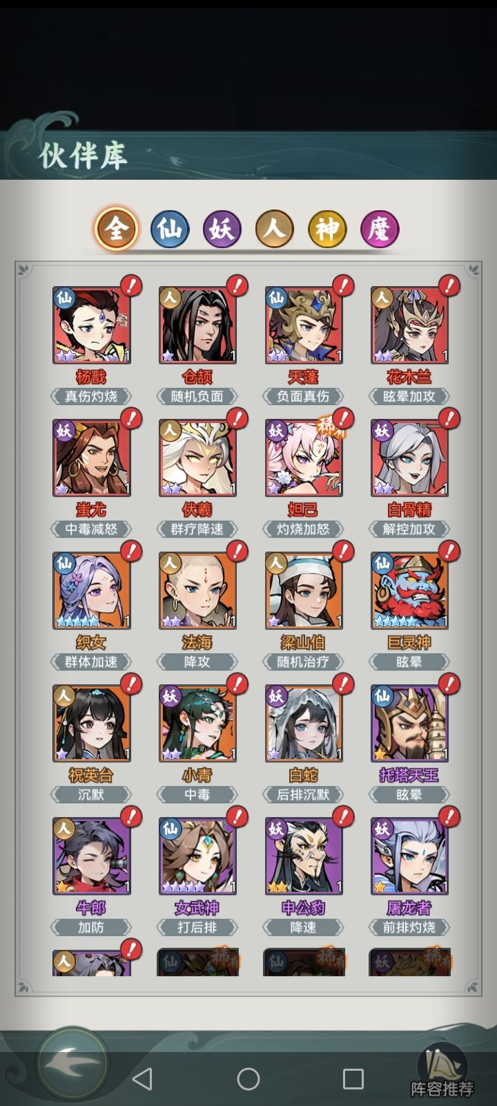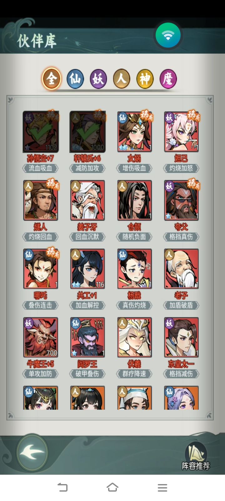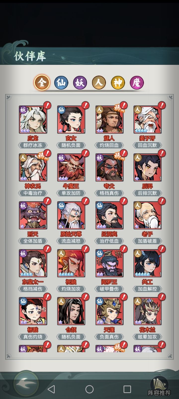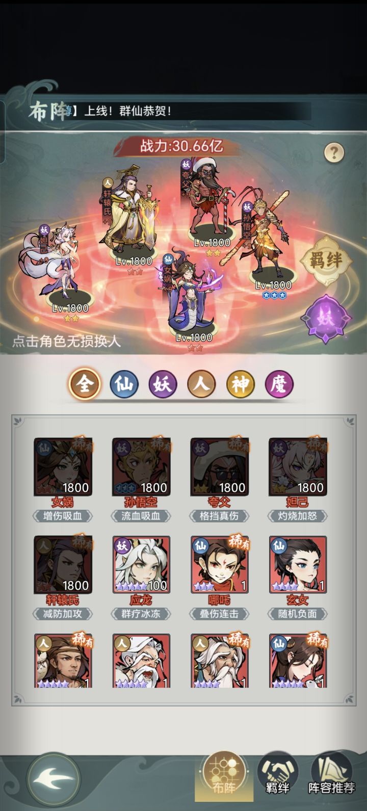 #发现好游戏 一款仙魔类的休闲放置挂机游戏。游戏中,访道寻仙,排兵布阵,多人仙战,挑战不周山,多样玩法。 前期推荐新手整容; 孙悟空为核心阵容 成员:孙悟空、女娲、轩辕、夸父、妲己 特点: * 孙悟空作为输出核心,拥有极高的爆发力和攻击力。 *女娲主坦,减伤叠攻能抗能打 * 轩辕提供buff增幅,增强队伍整体实力。 * 夸父和妲带有格挡灼烧效果己确保队伍的稳定输出。简单的操作方法、