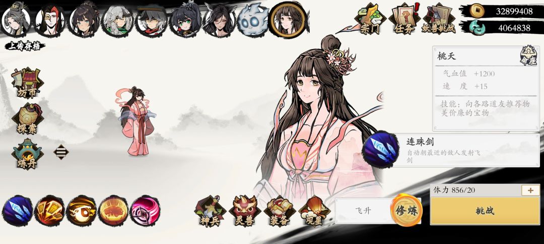 人物推荐桃夭(人物解锁可以看攻略,没有也可水韵儿),装备主要是华光项链(第一和最后一个辅助装备加成30%),神兵带皇金式,宠物带兔子,观星解锁玄武(10%),开局尽量第一个辅助法宝选皇金酒(没有就最后一个辅助法宝)然后尽快加满级,这里注意桃夭需要手动升级法宝(50秒按一次),皇金酒满级后后面升级一直点最后一个法宝就行(有一串铜钱25),最后看个广告或者广告卷领3倍奖励,最高一局能打到15000+铜