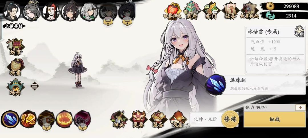 人物推荐桃夭(人物解锁可以看攻略,没有也可水韵儿),装备主要是华光项链(第一和最后一个辅助装备加成30%),神兵带皇金式,宠物带兔子,观星解锁玄武(10%),开局尽量第一个辅助法宝选皇金酒(没有就最后一个辅助法宝)然后尽快加满级,这里注意桃夭需要手动升级法宝(50秒按一次),皇金酒满级后后面升级一直点最后一个法宝就行(有一串铜钱25),最后看个广告或者广告卷领3倍奖励,最高一局能打到15000+铜