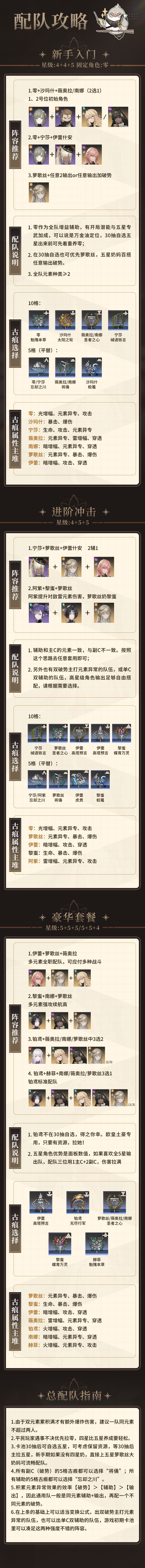 ➤目录 ①抽卡规划 ②5星自选 ③小贴士 ——————正文(未完待续)————— ➤①抽卡规划 测试了多个账号后 给出前期最优流程 ⒈先抽up池→出up角色后停手 ⒉后抽29+1抽新手池→自选『薇奥拉』 ⒊兑换完47抽普池→抽武器池 PS:公测版本『无实』强,所以先抽他的专武 (做角色——教学拿3抽=保底) 抽武器顺序:『鱼肠』>其他 ⒋五星自选拿『萝歌丝』=满配游戏体验 ⒌前期配队 『无实