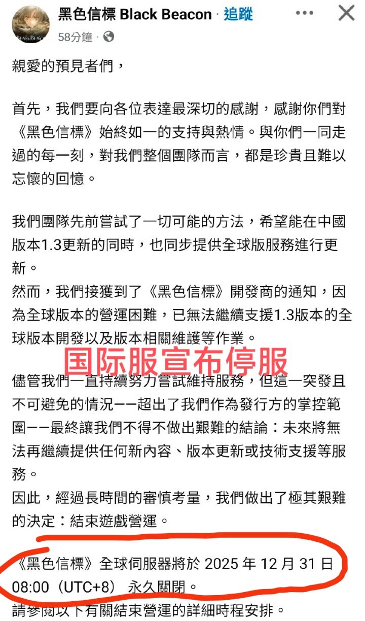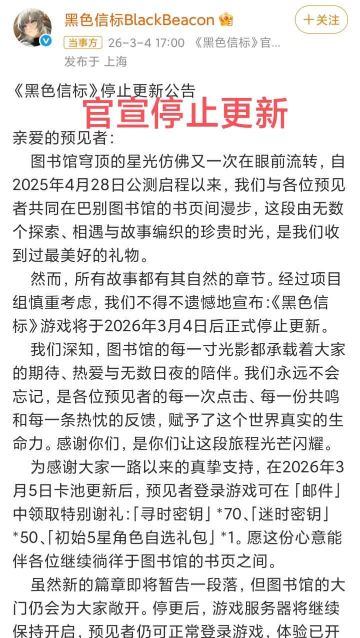 亲爱的预见者: 图书馆穹顶的星光仿佛又一次在眼前流转,自2025年4月28日公测启程以来,我们与各位预见者共同在巴别图书馆的书页间漫步,这段由无数个探索、相遇与故事编织的珍贵时光,是我们收到过最美好的礼物。 然而,所有故事都有其自然的章节。经过项目组慎重考虑,我们不得不遗憾地宣布:《黑色信标》游戏将于2026年3月4日后正式停止更新。 我们深知,图书馆的每一寸光影都承载着大家的期待、热爱与无