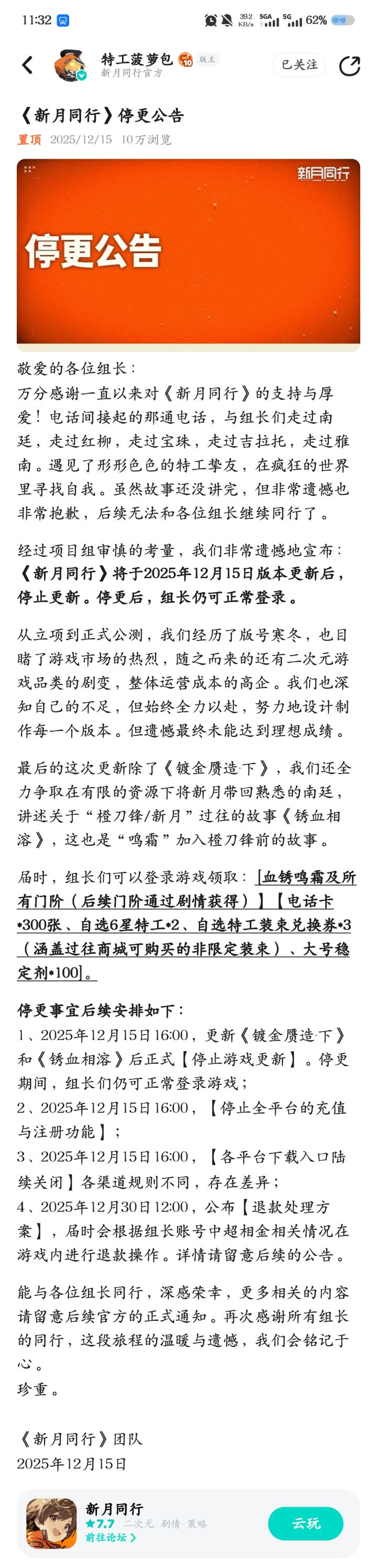 亲爱的预见者: 图书馆穹顶的星光仿佛又一次在眼前流转,自2025年4月28日公测启程以来,我们与各位预见者共同在巴别图书馆的书页间漫步,这段由无数个探索、相遇与故事编织的珍贵时光,是我们收到过最美好的礼物。 然而,所有故事都有其自然的章节。经过项目组慎重考虑,我们不得不遗憾地宣布:《黑色信标》游戏将于2026年3月4日后正式停止更新。 我们深知,图书馆的每一寸光影都承载着大家的期待、热爱与无