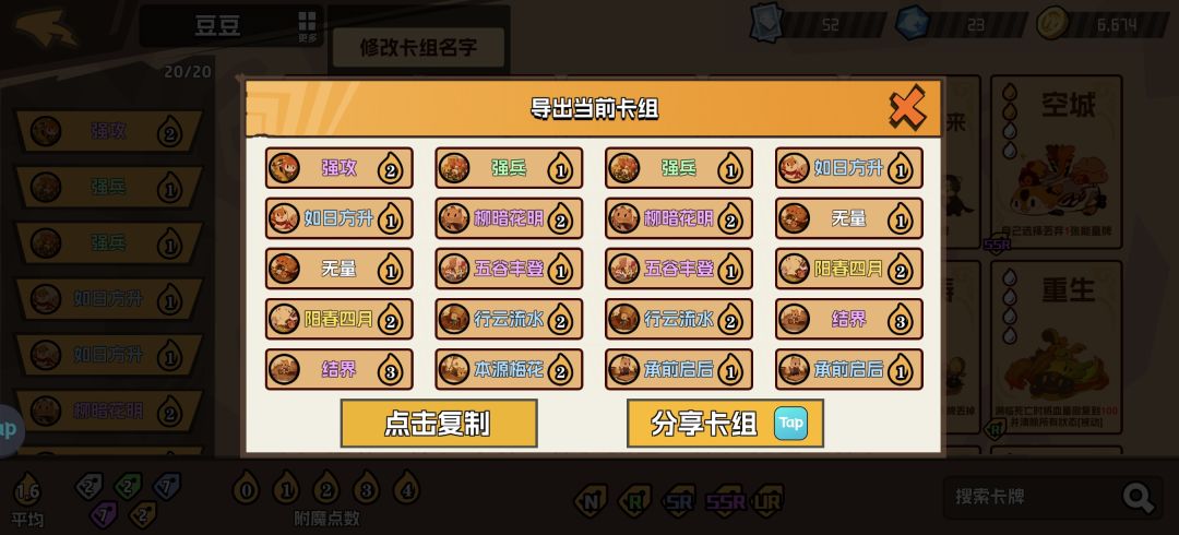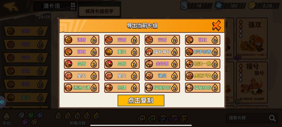 此贴仅供新玩家参考。目前最好玩的流派,清卡流。以下是清卡流所带的技能牌,新手拿去试试吧export:m531->1:连营,6:空城,6:空城,7:强攻,7:强攻,12:重生,13:福兮祸兮,16:妙手回春,17:血佑,17:血佑,18:金钟罩,21:孤注一掷,27:星火,27:星火,28:涌泉,75:虚张声势,76:扬汤止沸,80:东隅,87:福祸相依,87:福祸相依<-end#攻略