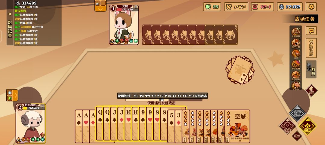 主要是大伙第一次玩,这游戏最重要的就是手里牌打空,或者本来你这个人物攻击力高,出的牌对面出不了,然后死了,一般都是打空。 其次技能牌是可以拖到普通牌上的,附魔这叫,让你的牌出的出去又不会那么多屯着,当然你也可以玩屯牌,第20回合全部打出去,是秒人的20回合开始,所以第19回合你就得卖,要输。打的好的附魔牌可以一下抵消三张牌一张技能两张普通。当你空牌的时候对面就扣血。 可以多看看牌组,找到适合自己。