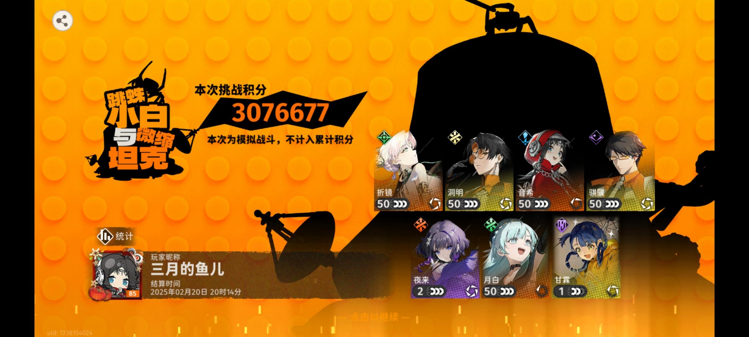 站位 1朝颜 2月白 3骐骥 4千秋(刺灰 恒砂更优) 支援 夜来 银峰/巫 前置把所有人物的能量打满支援技跟组长技能也打满。月白 跟 朝颜 给千秋上buff ,不要去普攻boss,boss会回血,千秋则一直开大,骐骥在boss第一次开大以前一直放二技能,当boss开完第一次大以后,在一直普攻boss。当boss开完第一次大以后,出现红色方块退出重新打,出现其他两个方块可以继续打。当boss放大的