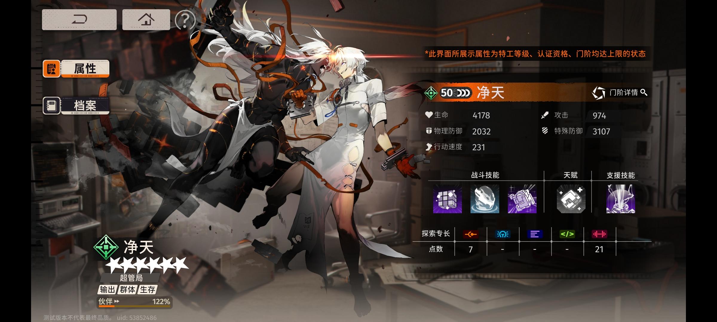 先说说这关特点:甘霖会单体援护,所以没办法上弥沙打持续压制;家泉奶量巨高,要么核爆要么群伤,但是我1门净天也还是伤害不够,会被奶回来;结会降速,伤害也挺高的;白槿会压制,伤害也高,对站位和清buff有要求。 阵容:启航,月白,恒沙,朝颜,支援夜来 门阶:启航劲量高门,月白0门也行,恒沙1门(0门没试过),朝颜4门 卡带:启航4高墙(因为我只有这套);月白2+2生命;恒沙4无主;朝颜2+2攻击 流畅